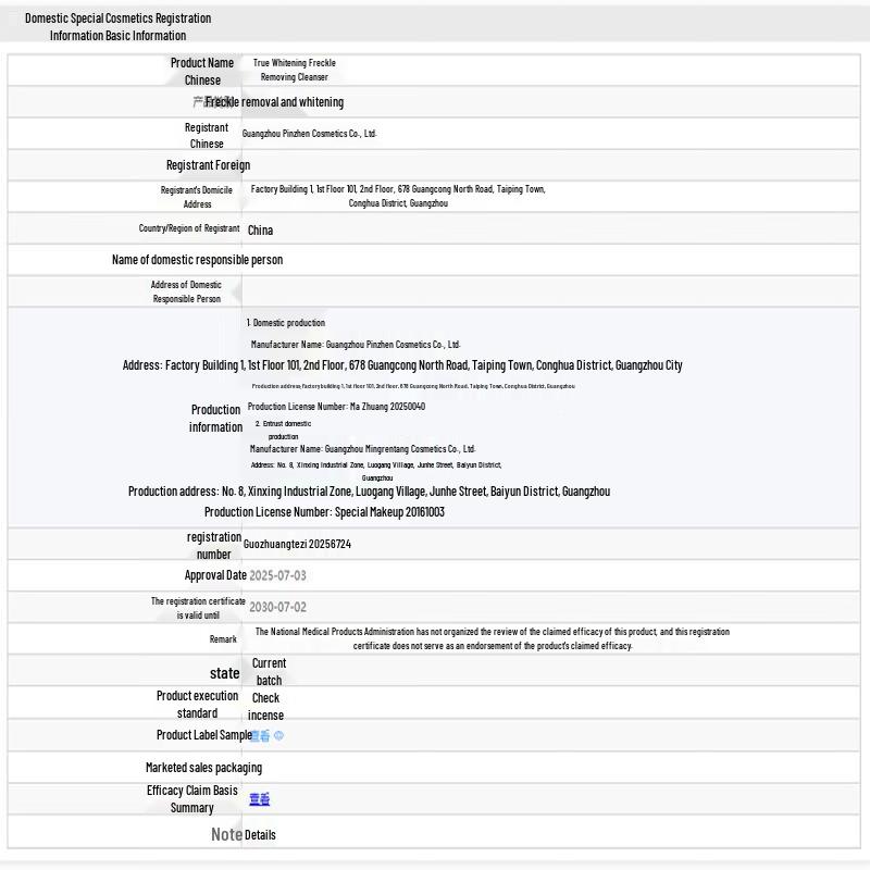 Product (registration/recordation) name: True Whitening Freckle Removing Cleanser