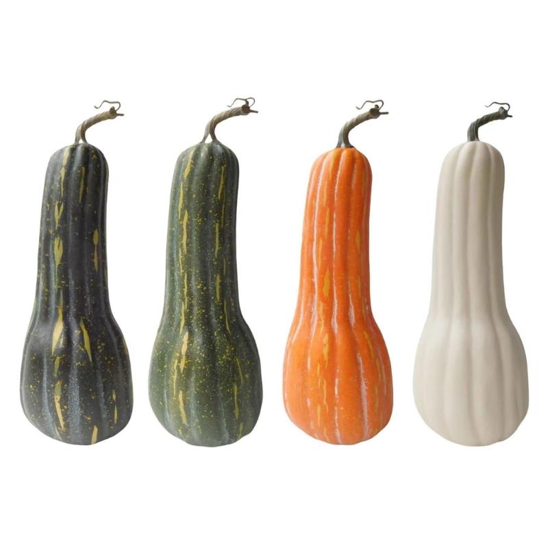 Realistic fake long pumpkins, length in 43cm (16.93inches), width in 16cm (6.3inches). Suitable for kitchen, fall harvest parties decorations, baskets display, party table decorations.