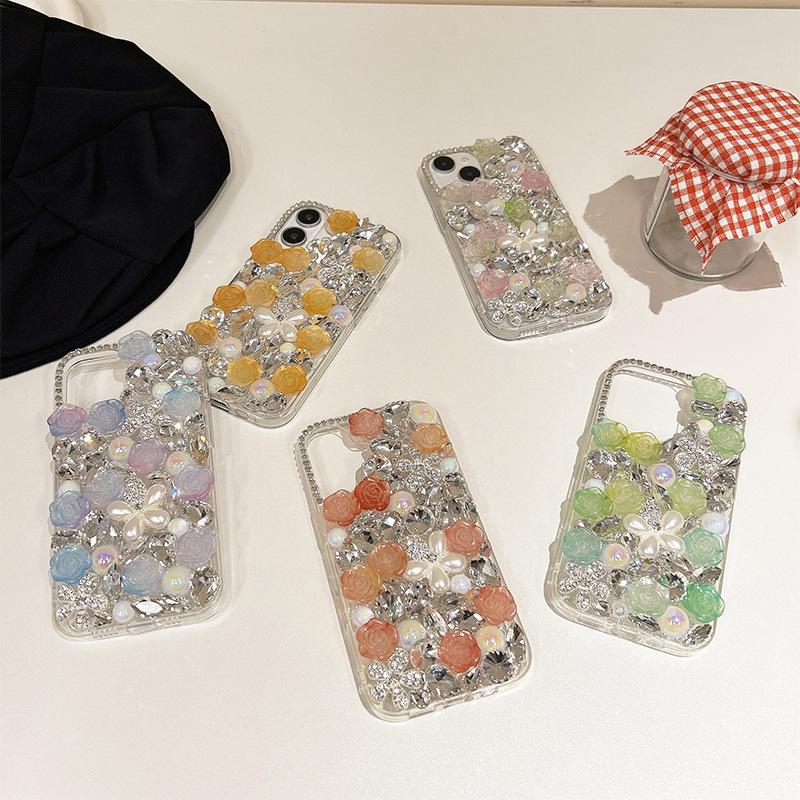For IPhone17promax Rhinestone Phone Case for Apple 15 Pearl Flower Luxury 14 Rose Flower 13 Hard Case