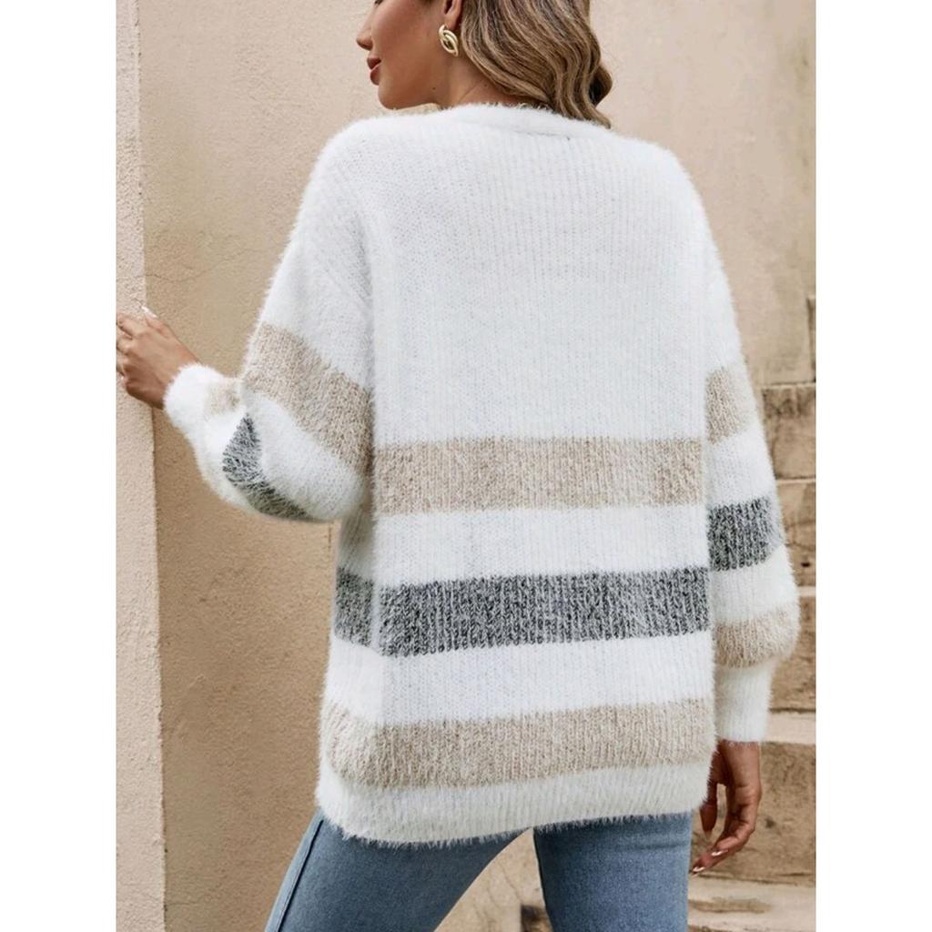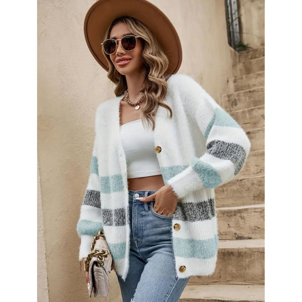 Женский плюшевый кардиган из шерсти с контрастными полосками, на пуговицах, с рукавами-фонариками, осень-зима