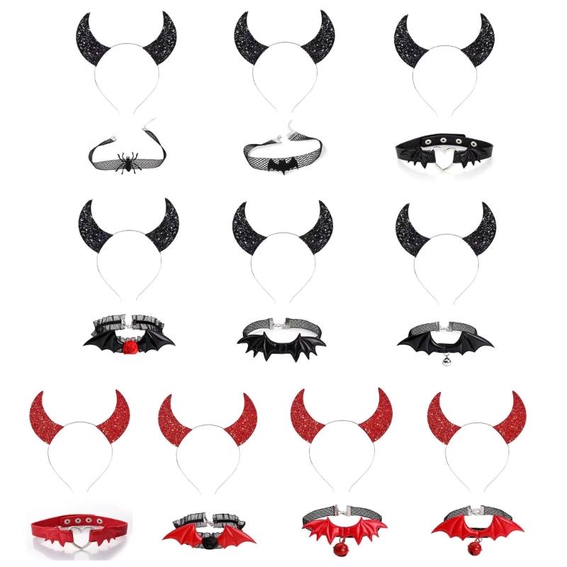 Готический Темный Блестящий Чокер-Коллар для Девочек с Розой и Дьявольским Крылом, Набор Ободков для Волос с Готическим Крылом Летучей Мыши, Универсальный Чокер
