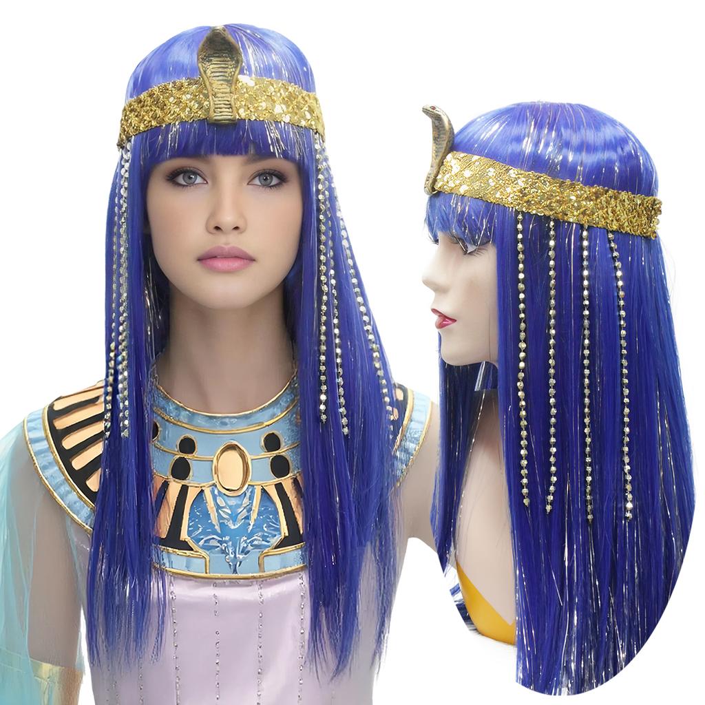 Синий Прямой Челка Синтетический Парик Клеопатра Змеиная Голова Головной Убор с Париком Королева Египта Парик