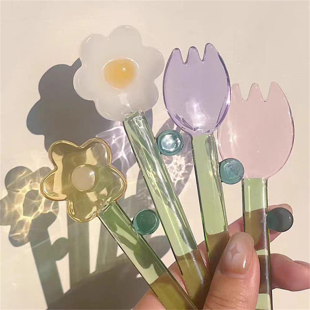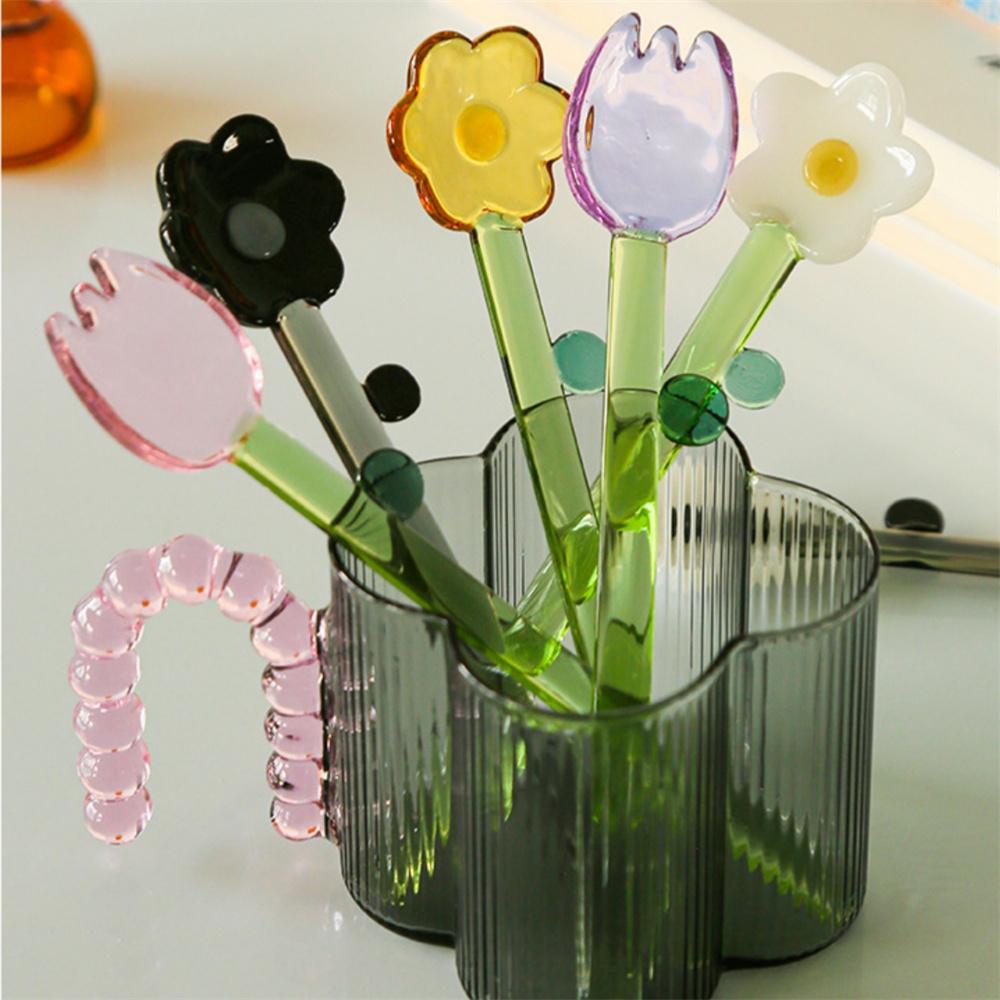 Длинная стеклянная ложка Креативная прозрачная стеклянная десертная ложка В форме цветка Цветная ложка-палочка для перемешивания кофе Барная кухонная ложка