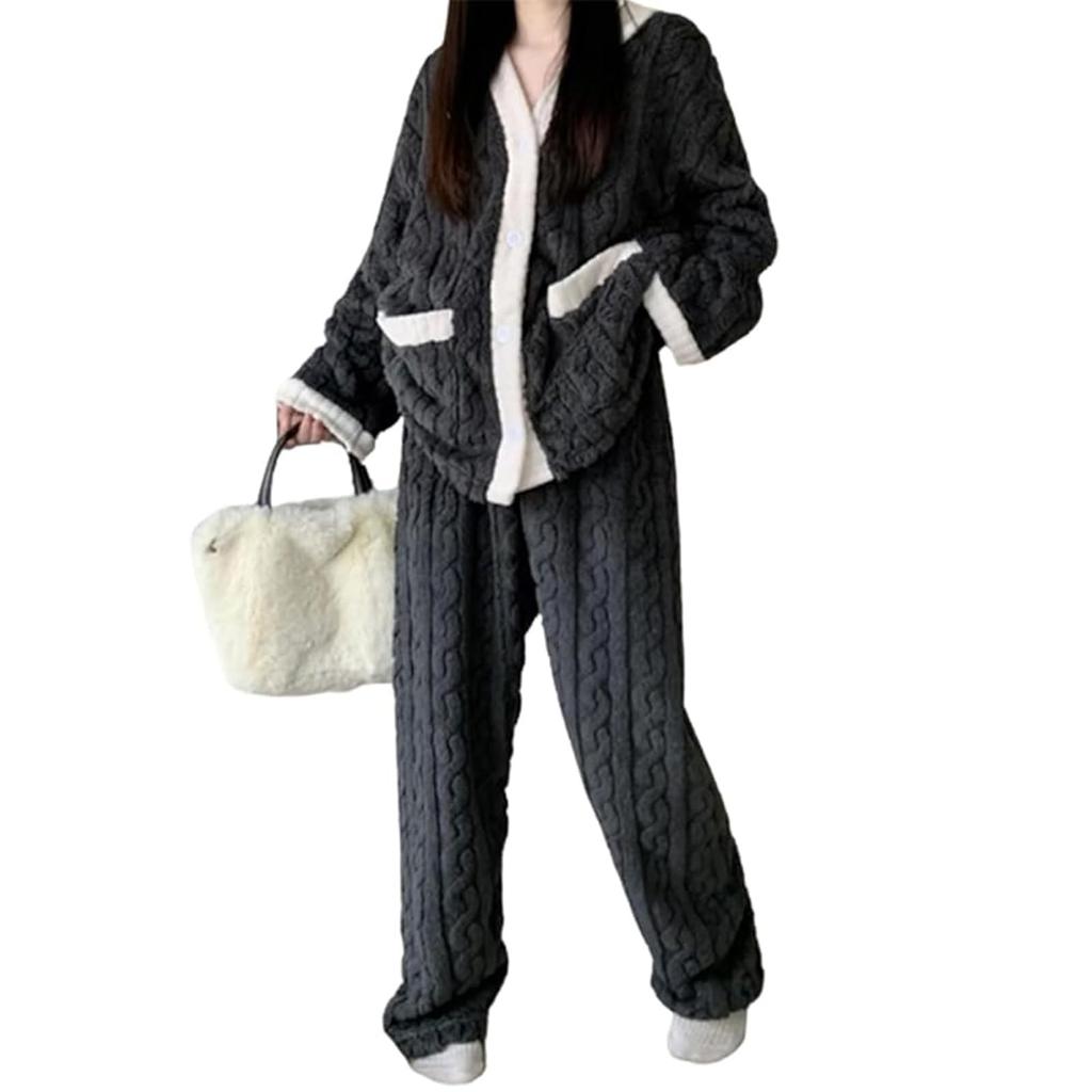 [Двусторонние пушистые зимние пижамы] Представляем эти теплые и пушистые пижамы! Изготовлено из высококачественной фланелевой ткани, нежной к коже. Пушистая ткань окутывает все ваше тело теплом, обеспечивая уникальный комфорт и сохранение тепла для отличного ночного сна.. Идеально подходит для того, чтобы согреть вас и защитить от холода дома! Ткань плотная и прочная, поэтому вы можете использовать их снова и снова.