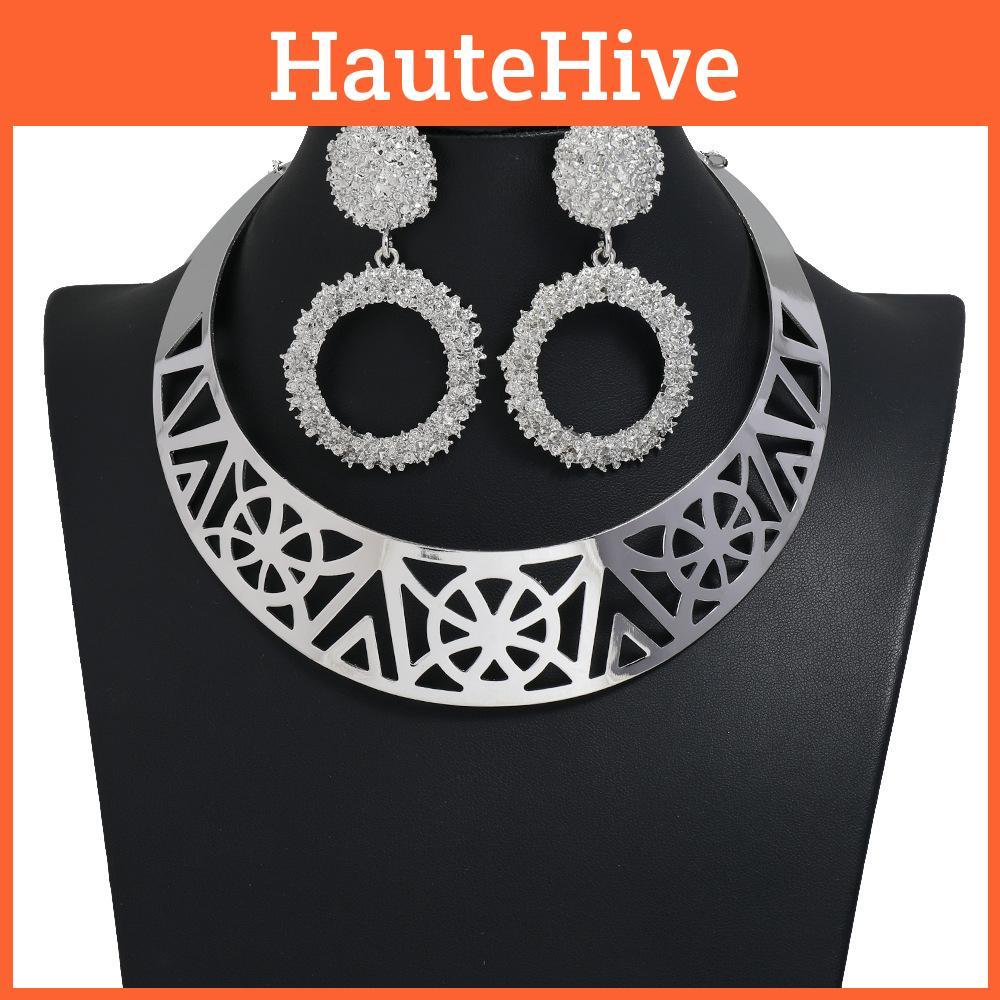 Solid Fashion Color Hollow Design Women Metal Necklace Collar Round Set Earring