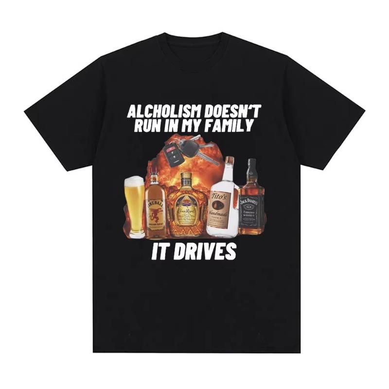 Funny Alcholism Doesnt Run in My Family It Drives T Shirt Drunk Driving Men Women Fashion Hip Hop T-shirt Casual Cotton T-shirts