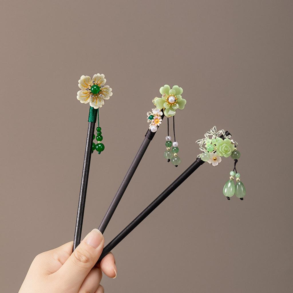 Элегантная заколка для волос с кисточкой в виде цветка, маленькая свежая зеленая серия, деревянная палочка для волос для женщин, ручная работа, глазурованная бижутерия, аксессуары для волос
