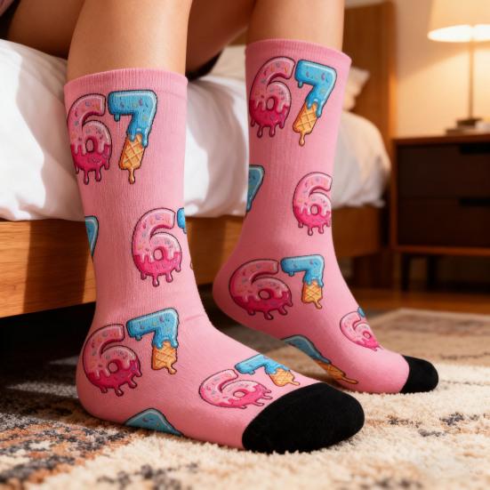 Уникальный 6 7 Дизайн мема: Эти носки с яркими и привлекающими внимание 6 7 мемами добавят вашему гардеробу индивидуальности и игривости.. Идеальные для тех, кто любит выражать свой уникальный стиль, эти забавные носки станут поводом для разговора в неформальной обстановке, например, в офисе, на светских мероприятиях или на открытом воздухе.