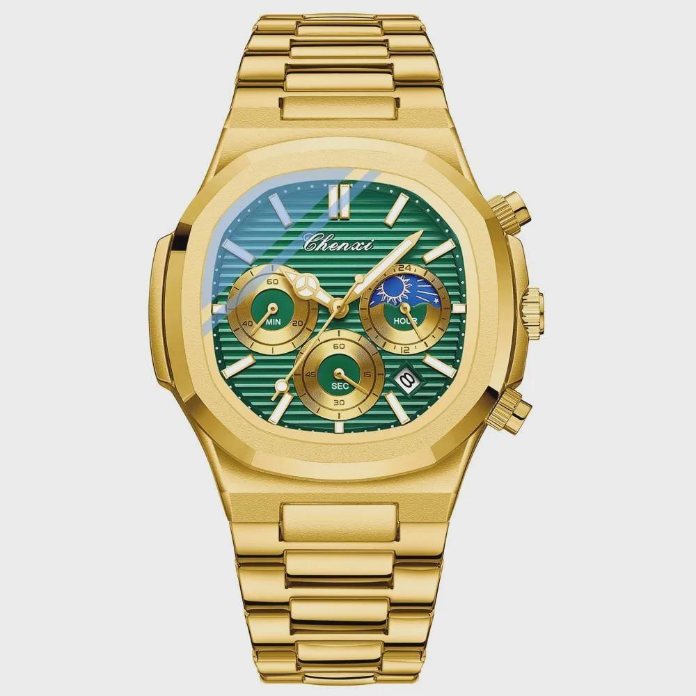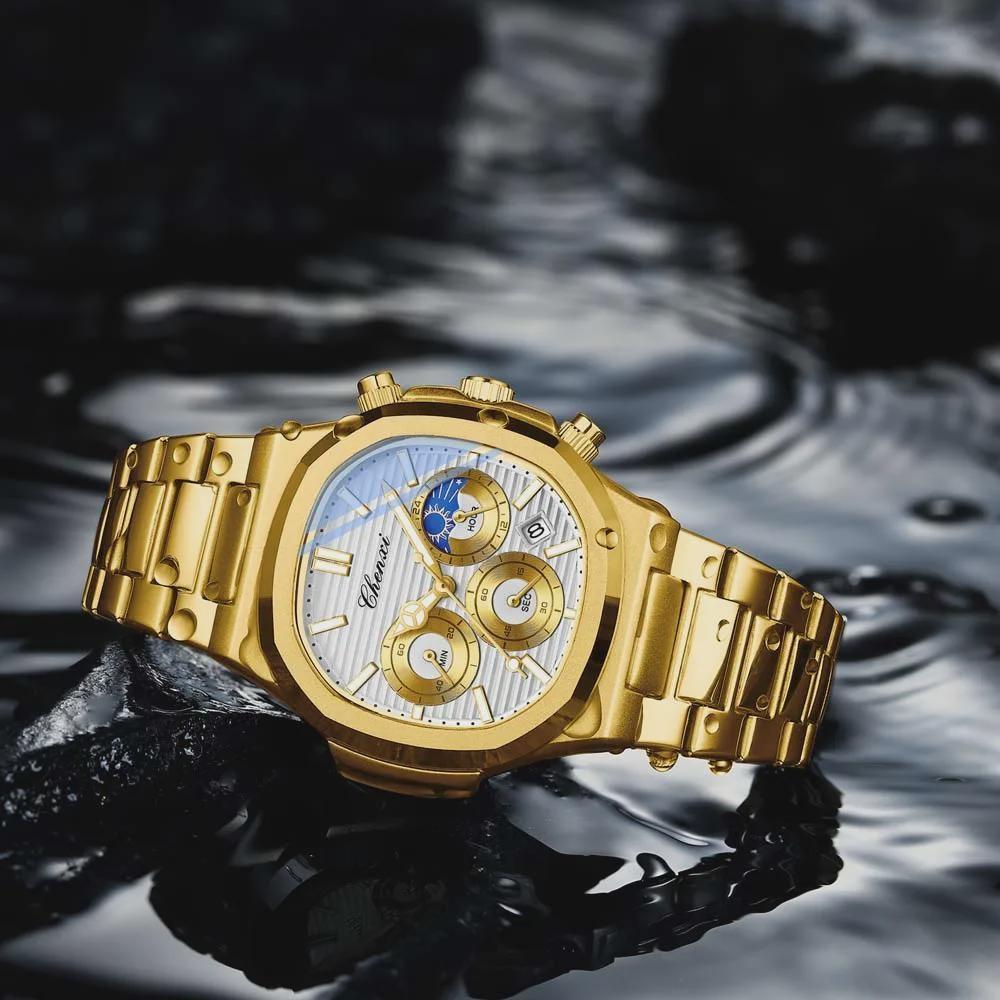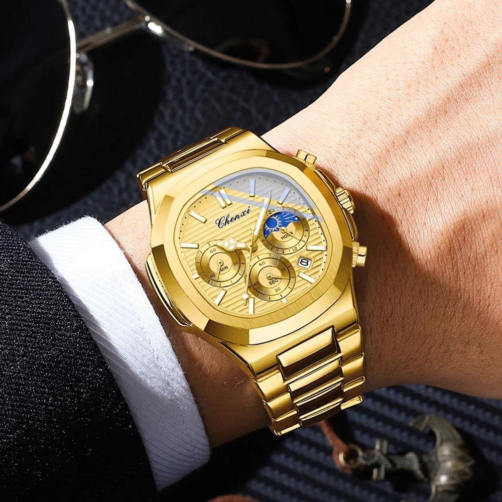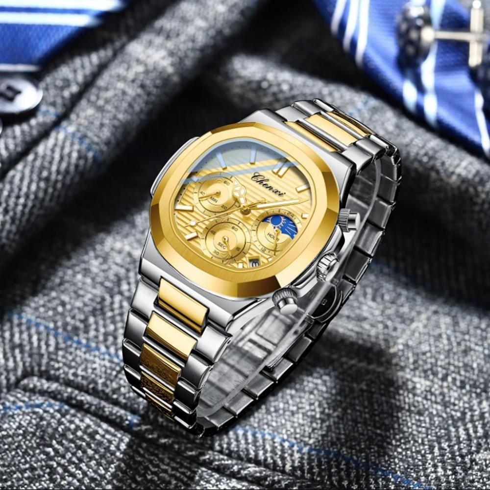 Men's Multifunction Quartz Watch Chronograph Luminous Water-Resistant Luxury Golden Steel Bracelet Men Moonswatch