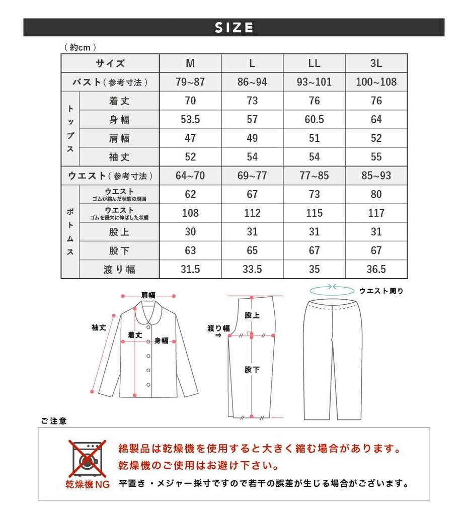 ●Caution: Cotton products may shrink significantly when dried in a dryer, so please avoid using a dryer.