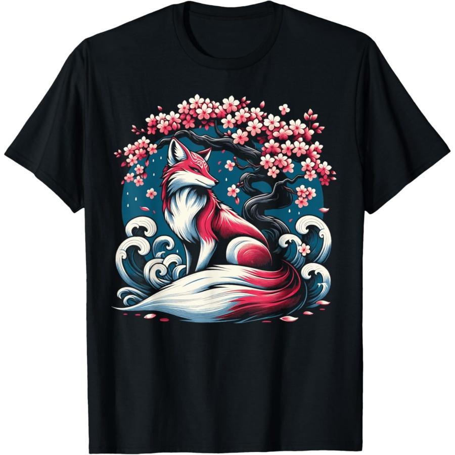 Футболка с лисой, японской девятихвостой лисой, и цветами сакуры