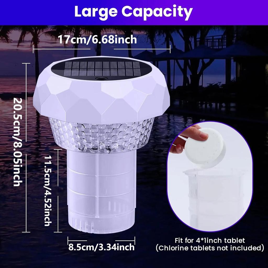 【Хлоратор для бассейна 2-в-1】Хлоратор для таблеток хлора является как функциональным инструментом для бассейна, так и декоративным аксессуаром. После добавления таблеток хлора (не включено), Он выполняет свою основную роль, а также улучшает ночной вид вашего бассейна【Простой в использовании】Прост в эксплуатации — поместите хлорную таблетку внутрь, закройте крышку, поверните, чтобы зафиксировать, и защелкните застежку. Это гарантирует, что поплавок остается в вертикальном положении, не тонет и надежно удерживает хлорные таблетки на месте во время использования【Работает на солнечной энергии и экологически чистый】Оснащен встроенным аккумулятором емкостью 1200 мАч, который заряжается от солнечной энергии в течение дня и автоматически включается ночью (при включении).Входящий в комплект пульт дистанционного управления позволяет регулировать освещение, добавляя атмосферу вашему бассейну【Блестящие световые эффекты】Этот хлорный поплавок для бассейна предлагает несколько статических цветов света и три динамических режима (перекатывающийся, дышащий и мигающий), с четырьмя регулируемыми уровнями яркости и скорости, что делает его идеальным для различных настроек бассейна【Прочная и водонепроницаемая конструкция】Изготовленный из высококачественного ПВХ-материала, хлоратор рассчитан на то, чтобы выдерживать сильный солнечный свет и суровые погодные условия в течение всего года. Благодаря водонепроницаемости IP68 и надежной крышке для лампы, он создан для надежной работы в любую погоду.