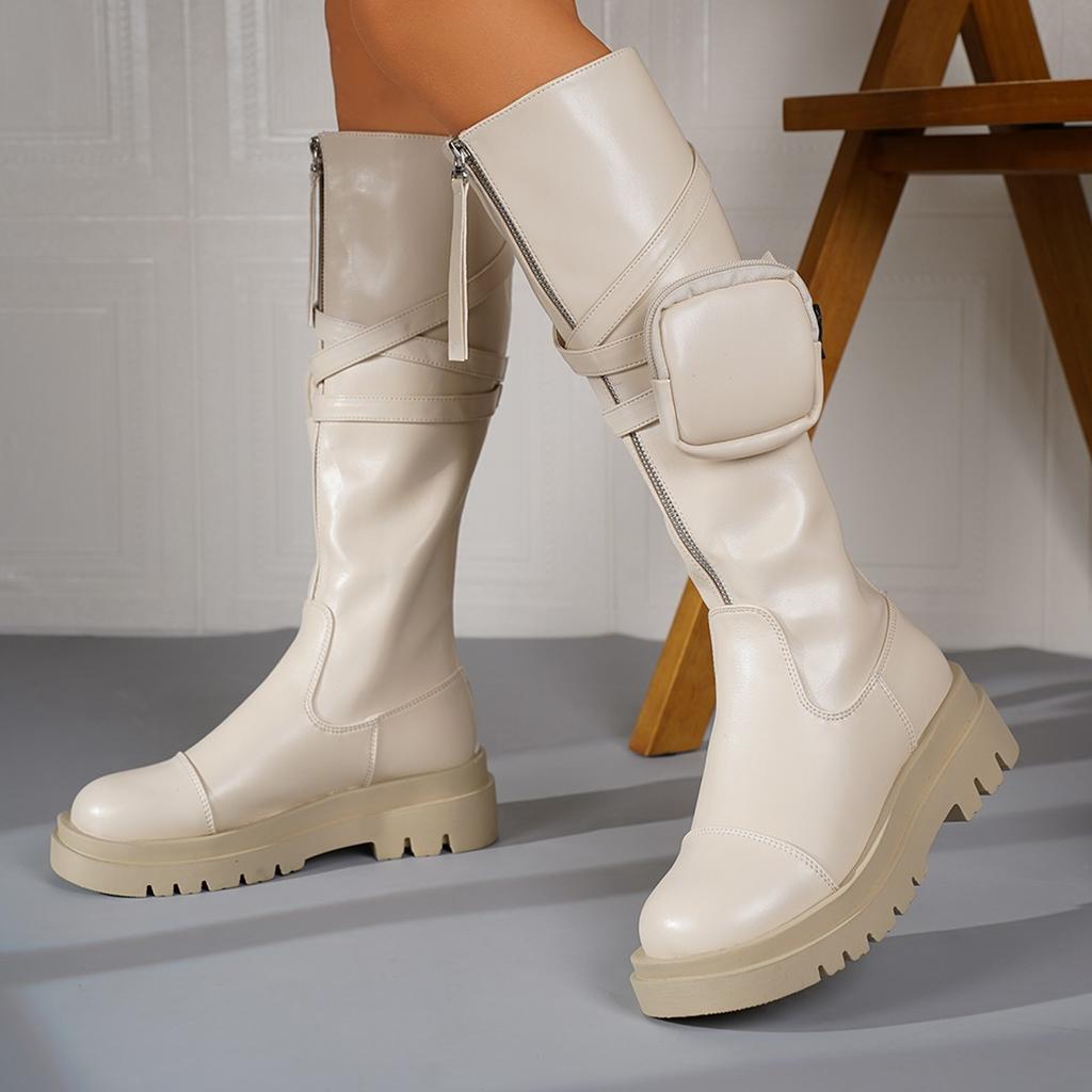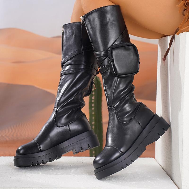 Мода Модные женские черные мотоциклетные ботинки с карманами из искусственной кожи на платформе, высокие сапоги до колена, женские, толстая подошва, нескользящие, длинные, Botas Mujer