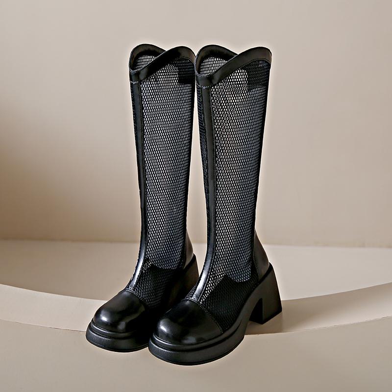 Модные женские высокие сапоги, летние, тонкие, круглые, с марлевой полой дышащей платформой, модные сапоги