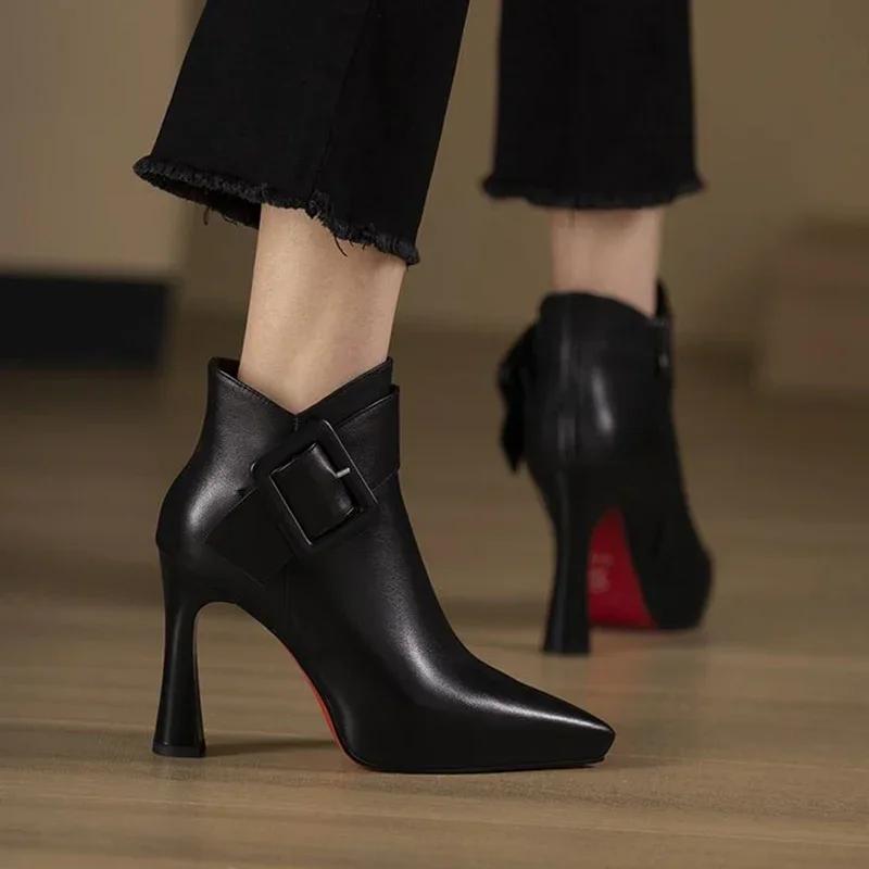 Модные женские элегантные ботильоны на высоком каблуке 2024 года, короткие сапоги из искусственной кожи с пряжкой на ремне, женские туфли на тонком каблуке большого размера 43 для вечеринок