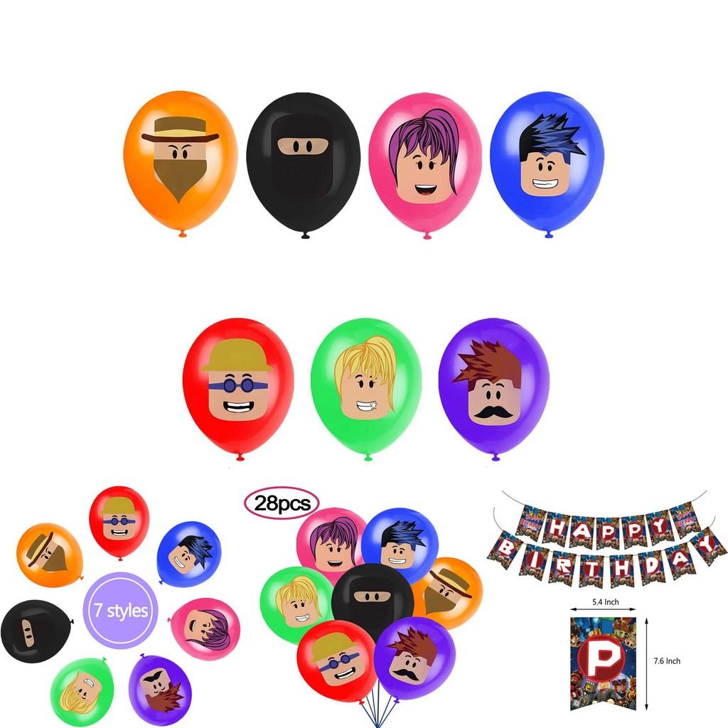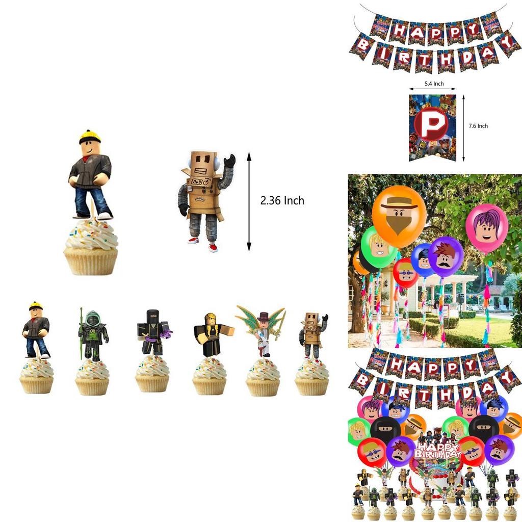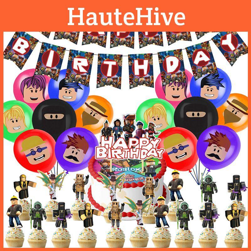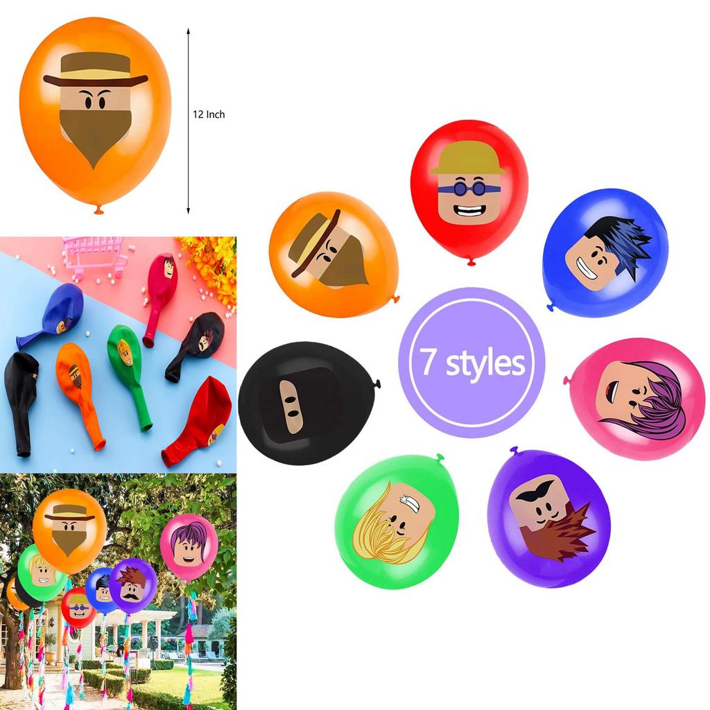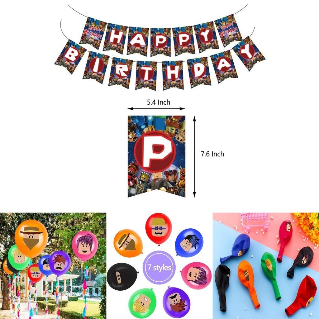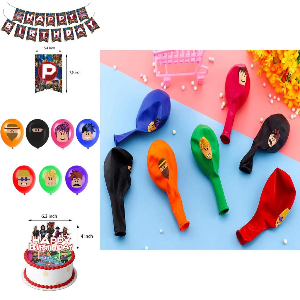Ярко оформленный декор для мальчишеской вечеринки в стиле Roblox с воздушными шарами и топперами для торта
