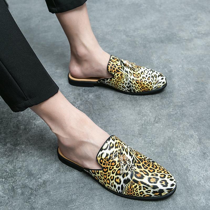 Модные летние полуботинки без застежек для мужчин, кожаные тапочки, повседневные мюли, дышащие удобные мокасины большого размера, леопардовая мода