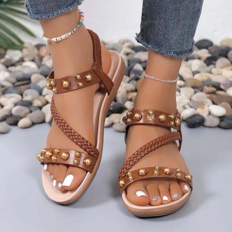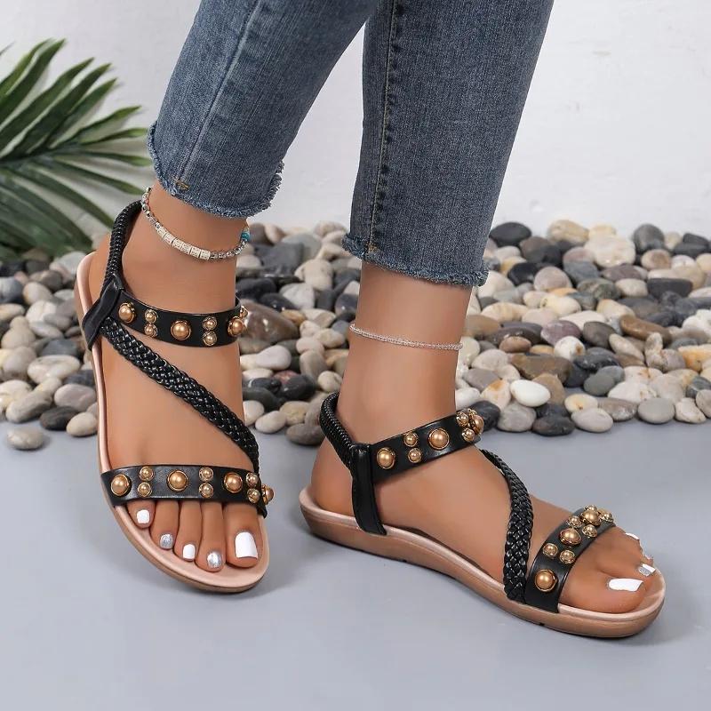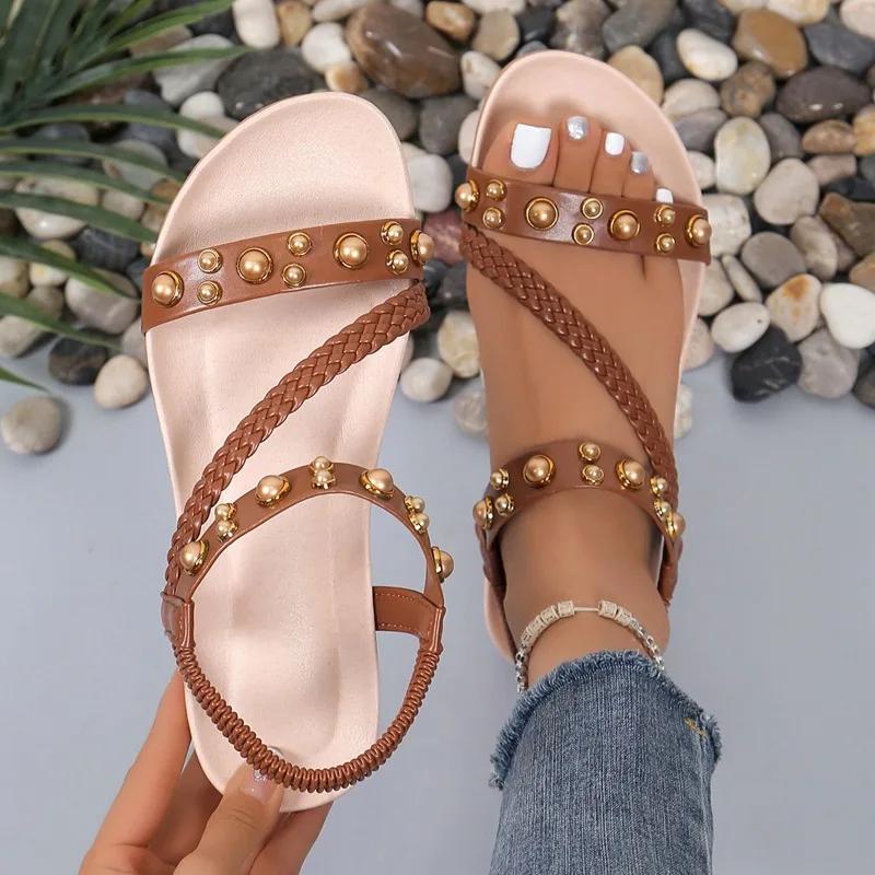 Модная обувь для женщин 2024 года, модные летние женские босоножки с резинкой, однотонные бусины, открытый носок, на низком каблуке, большой размер 43, повседневные босоножки