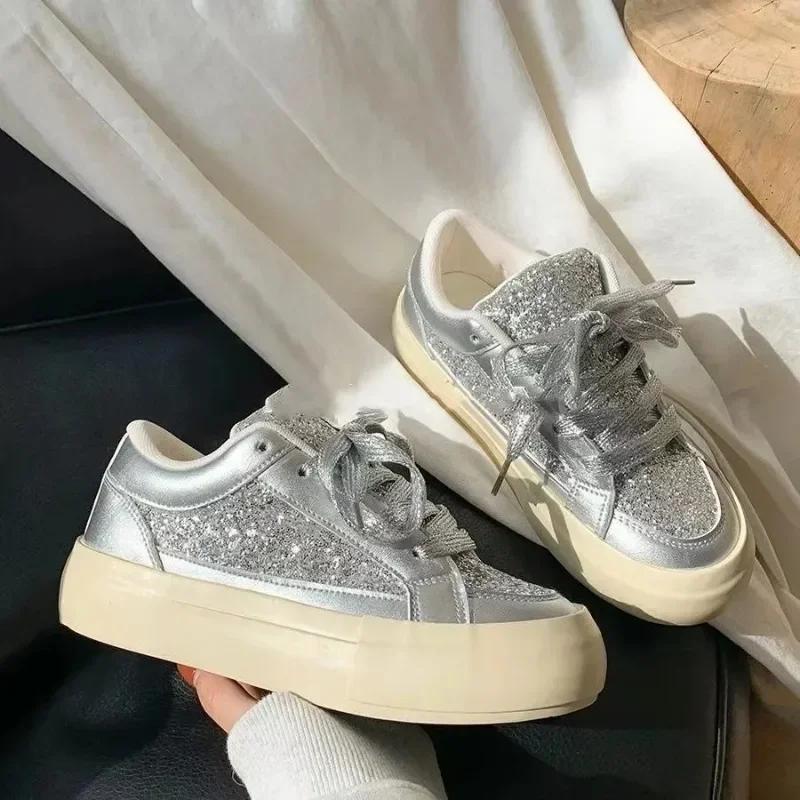 Модные летние женские блестящие низкие кроссовки, новые туфли на шнуровке и платформе для увеличения роста, для женщин, повседневная женская обувь для ходьбы