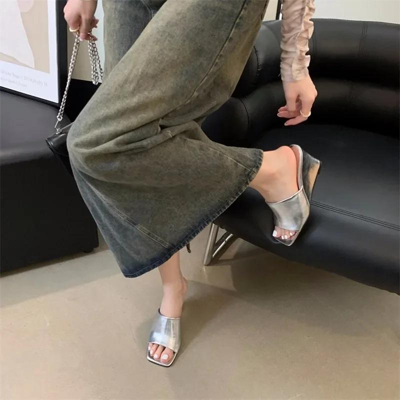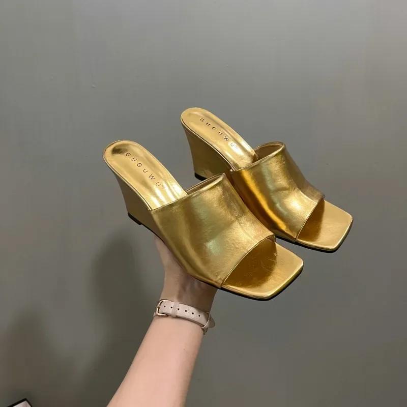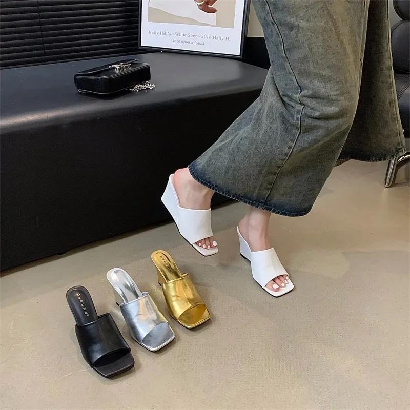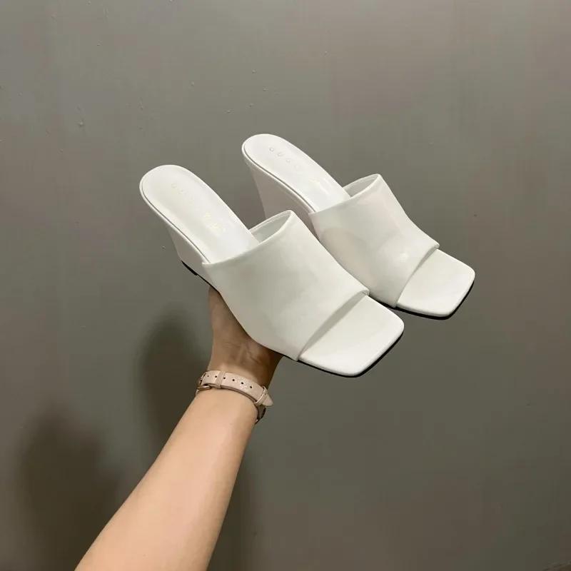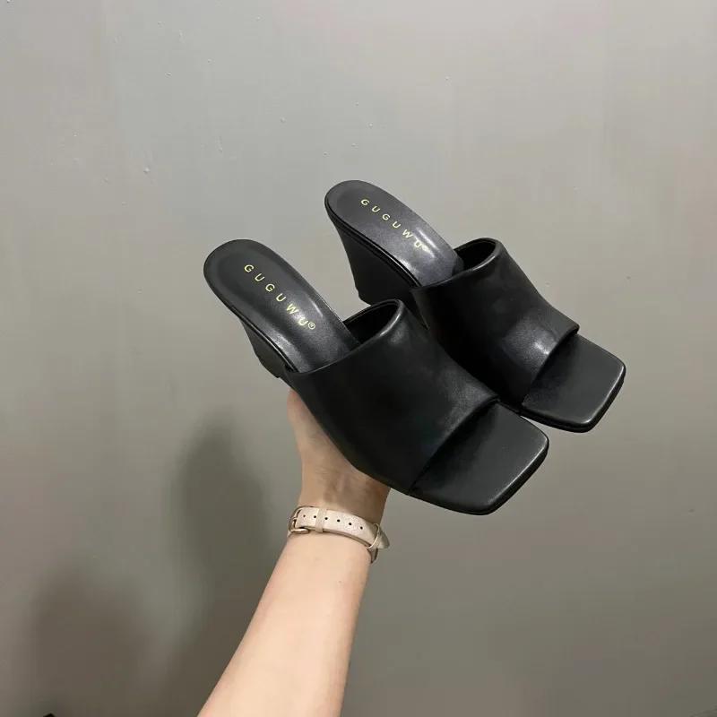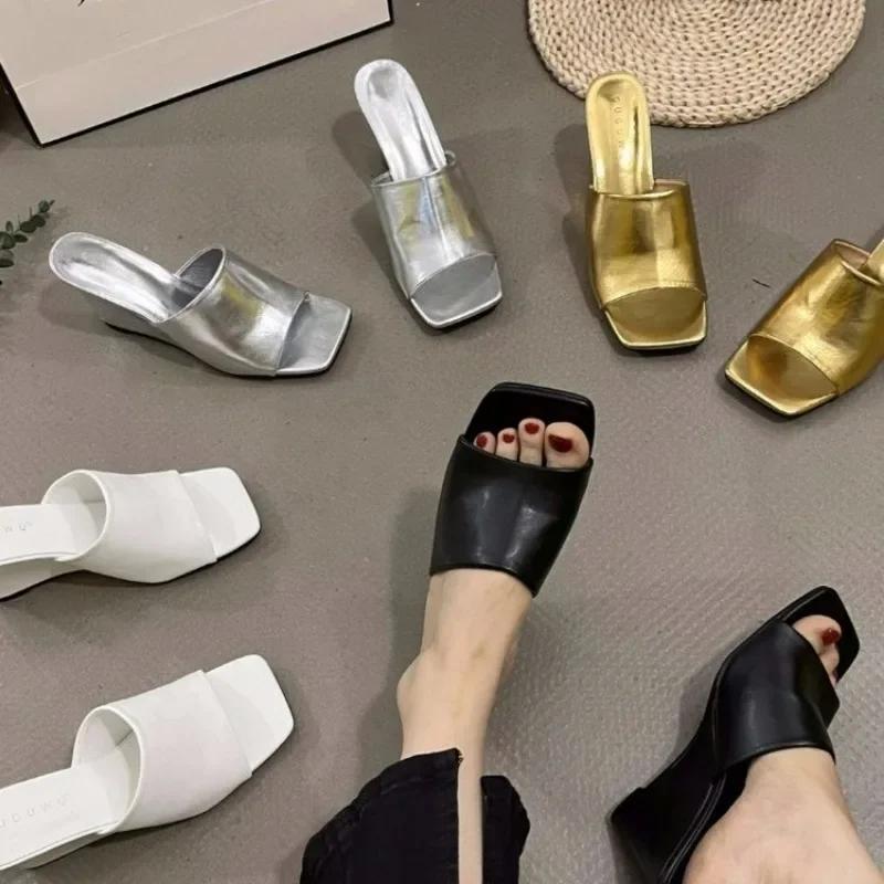 Модная женская обувь 2024 года, женские тапочки высокого качества с открытым носком, летние современные тапочки для женщин, квадратный носок, высокая танкетка, женская уличная обувь