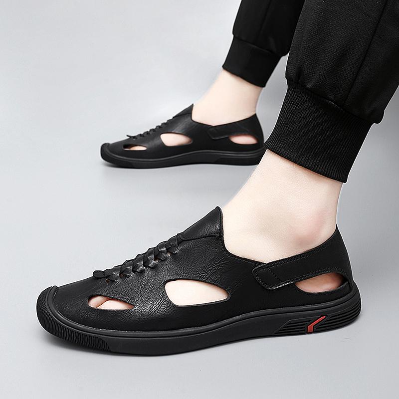 Модные мужские сандалии 2024 года, летние новые трендовые дышащие кожаные мужские повседневные сандалии, модные пляжные сандалии на плоской подошве, мягкая обувь для мужчин, большой размер