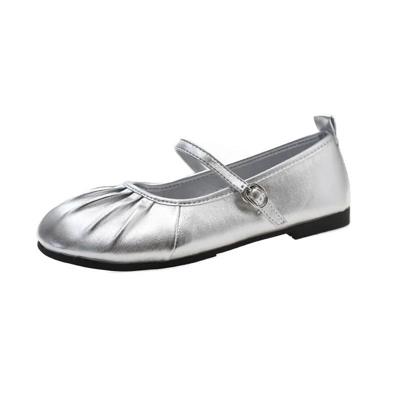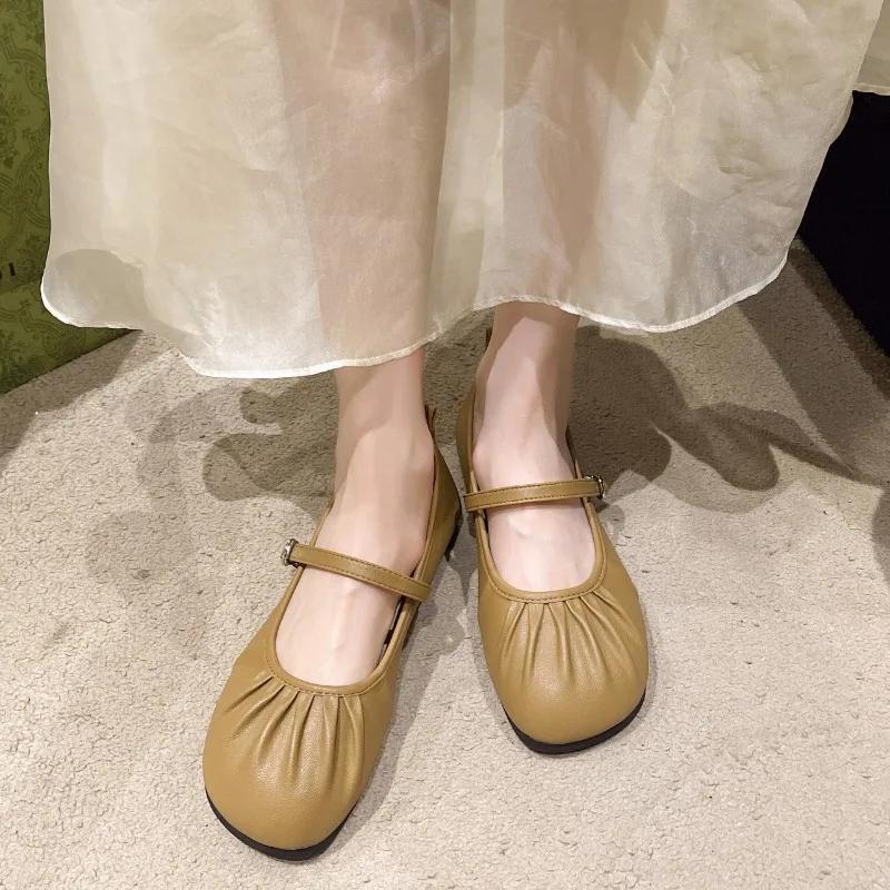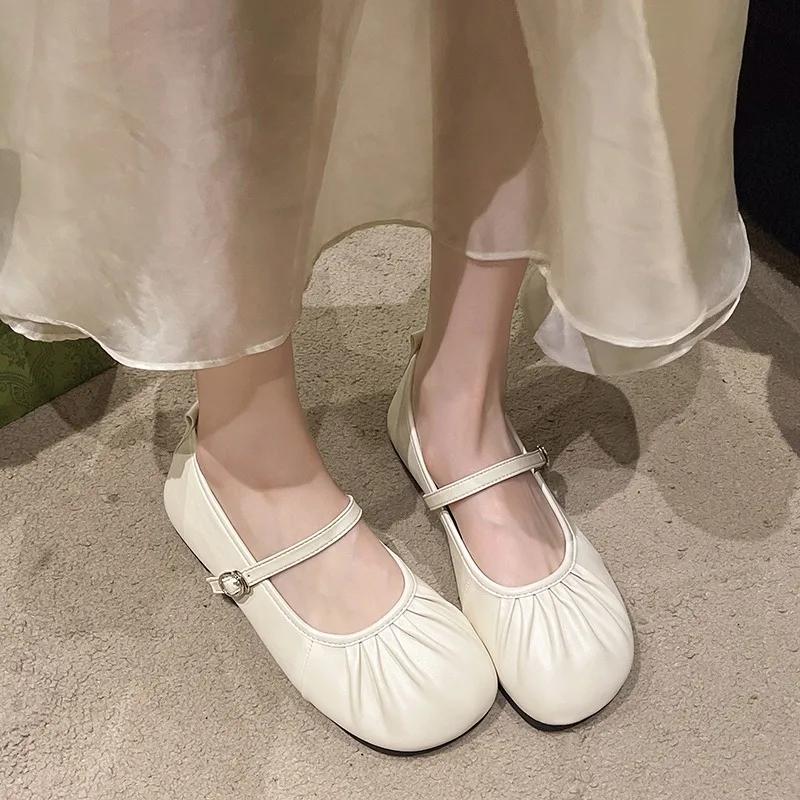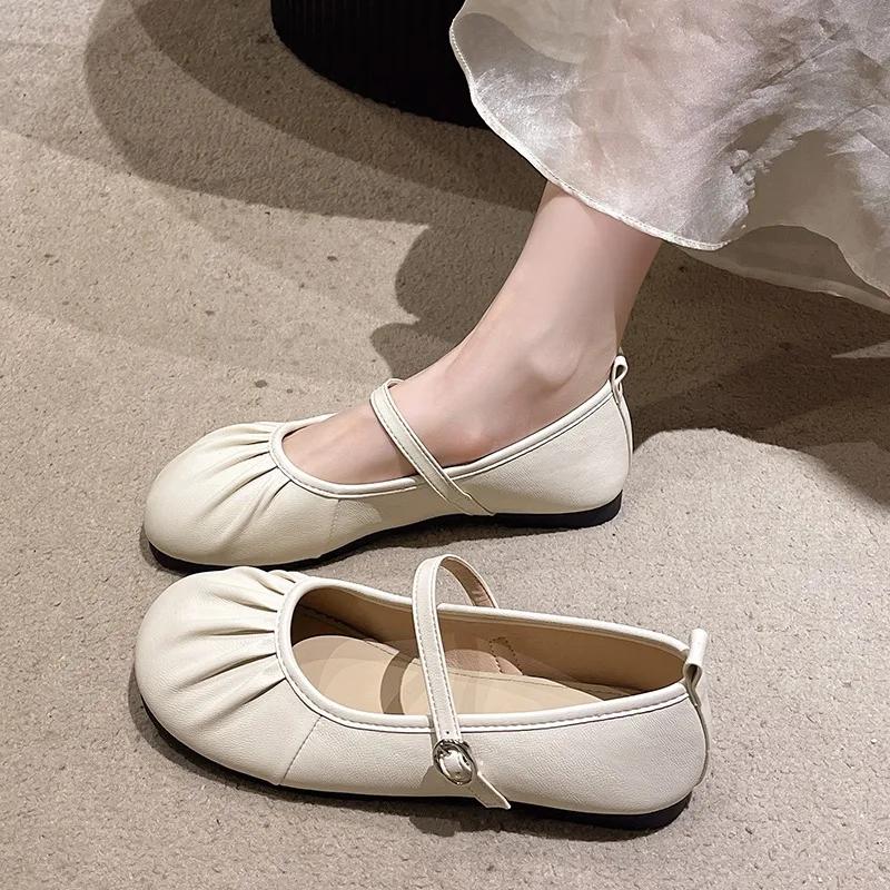 Модная женская обувь 2024 года, горячая распродажа, женские туфли на плоской подошве с пряжкой на ремешке, модные туфли на плоской подошве с мелким фасолью, брендовые плиссированные туфли на плоской подошве с круглым носком и низким каблуком