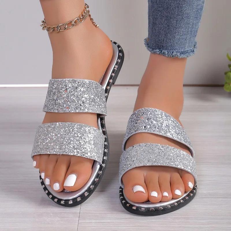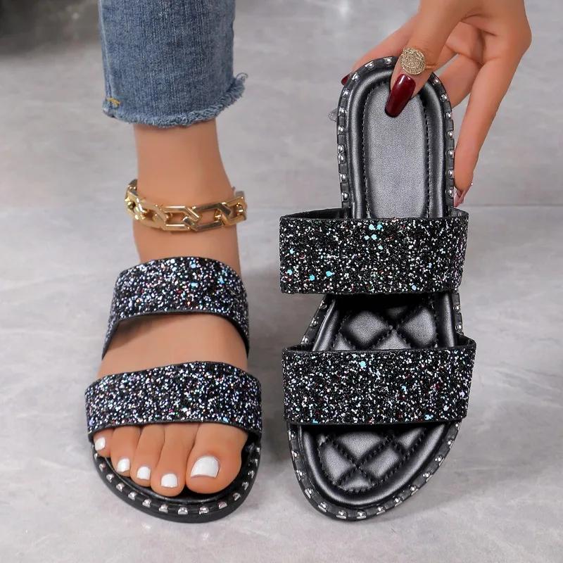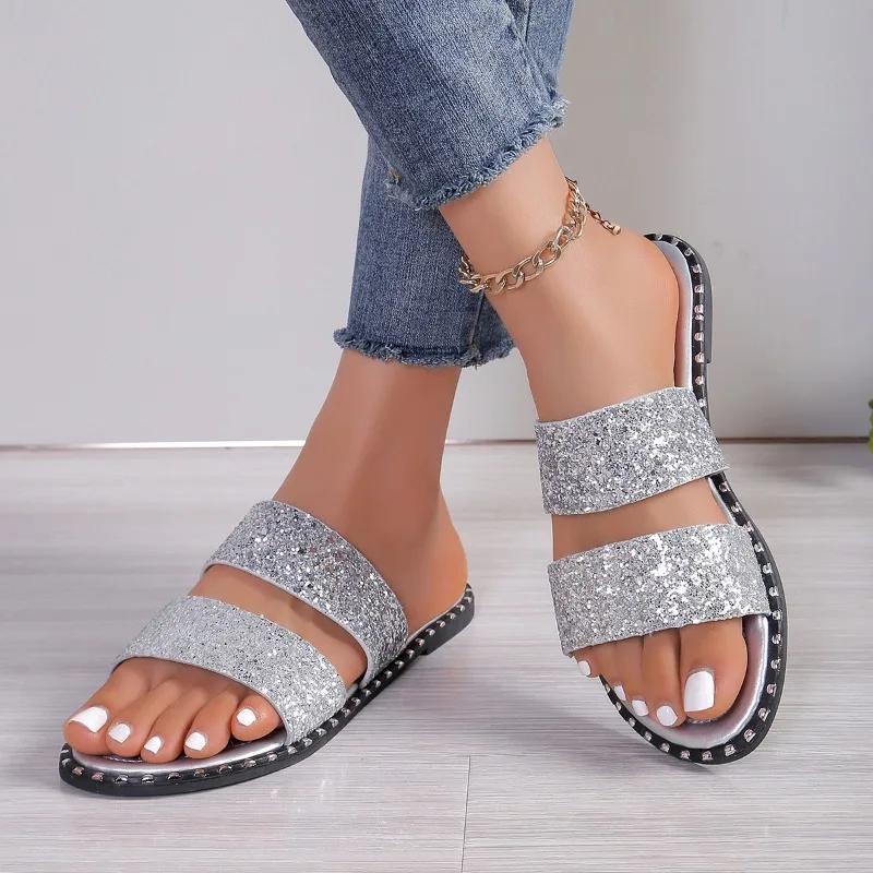 Модная женская обувь 2024 года, горячая распродажа, женские тапочки больших размеров, классические современные тапочки, женские туфли на плоской подошве с круглым носком и блестящими краями