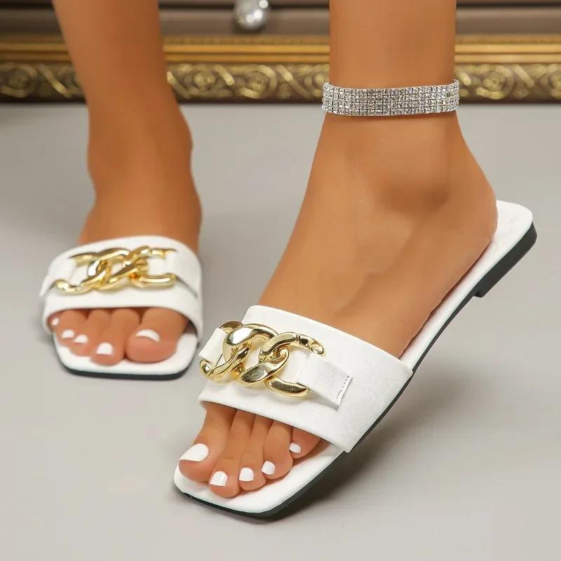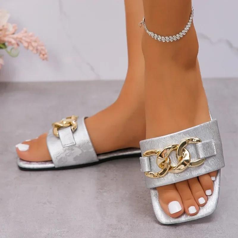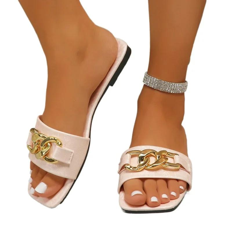 Модная обувь для женщин 2024 года, горячая распродажа, женские тапочки с квадратным носком, летние тапочки с открытым носком и цепочкой, однотонные, повседневные, пляжные, большого размера