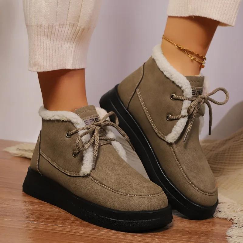 Модная женская обувь 2024 года, новые женские ботинки со шнуровкой спереди, модные повседневные ботинки с круглым носком, женские зимние короткие плюшевые теплые зимние ботинки