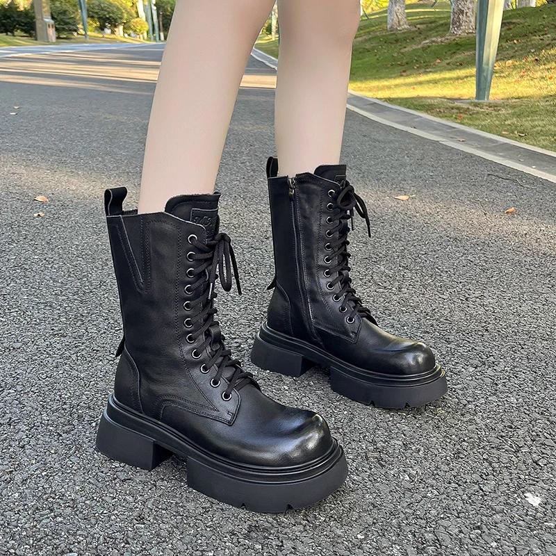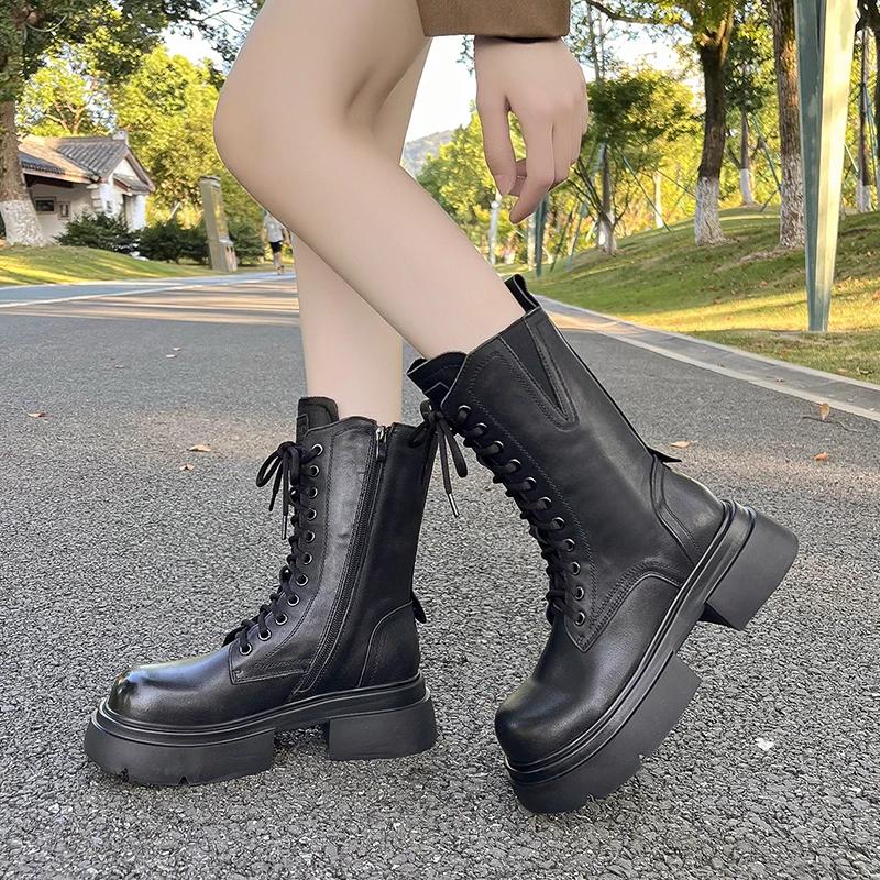 Мода 2024 года, высококачественная женская обувь, женские ботинки с боковой молнией, модные современные ботинки со шнуровкой спереди, женские новые ботинки до середины икры с круглым носком