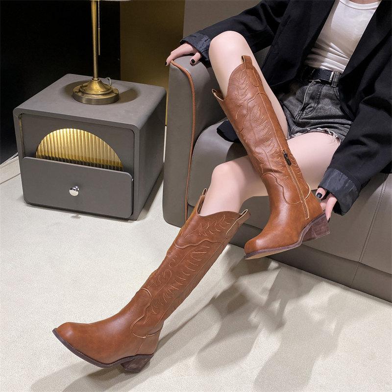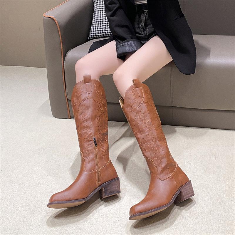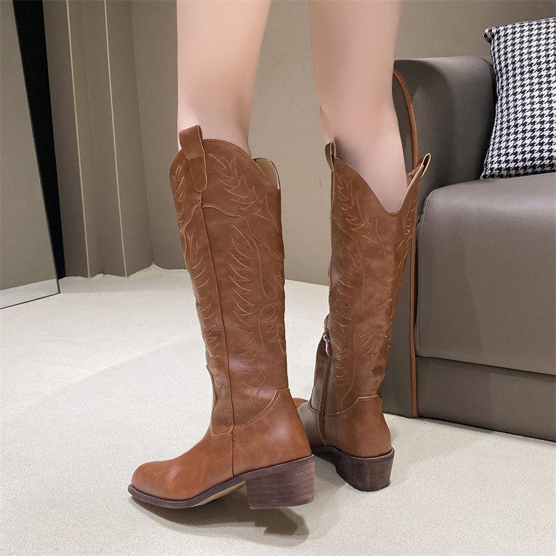 Модные вышитые ковбойские сапоги в западном стиле, женские осенние сапоги с круглым носком и толстым каблуком, высокие сапоги для женщин, винтажные длинные ботинки из искусственной кожи с V-образным вырезом