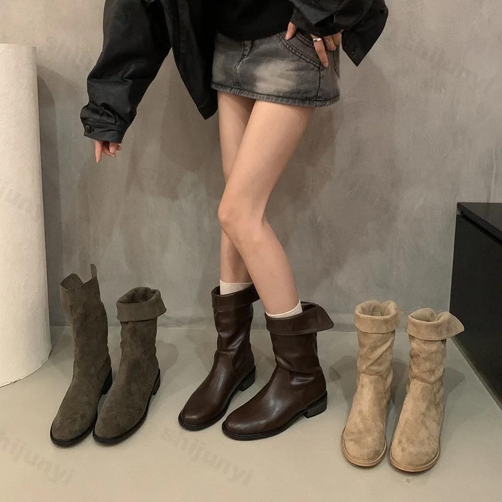 Модные женские сапоги на высоком каблуке с плиссе до середины голени, осенне-зимние женские модные кожаные сапоги в стиле вестерн, женские сапоги-ковбойши с острым толстым каблуком