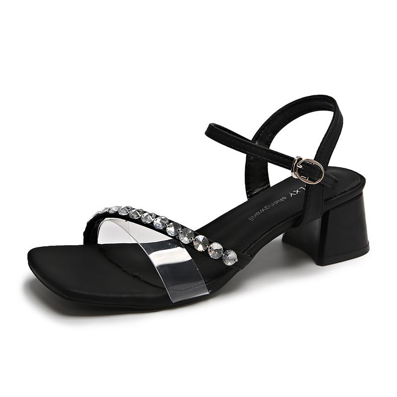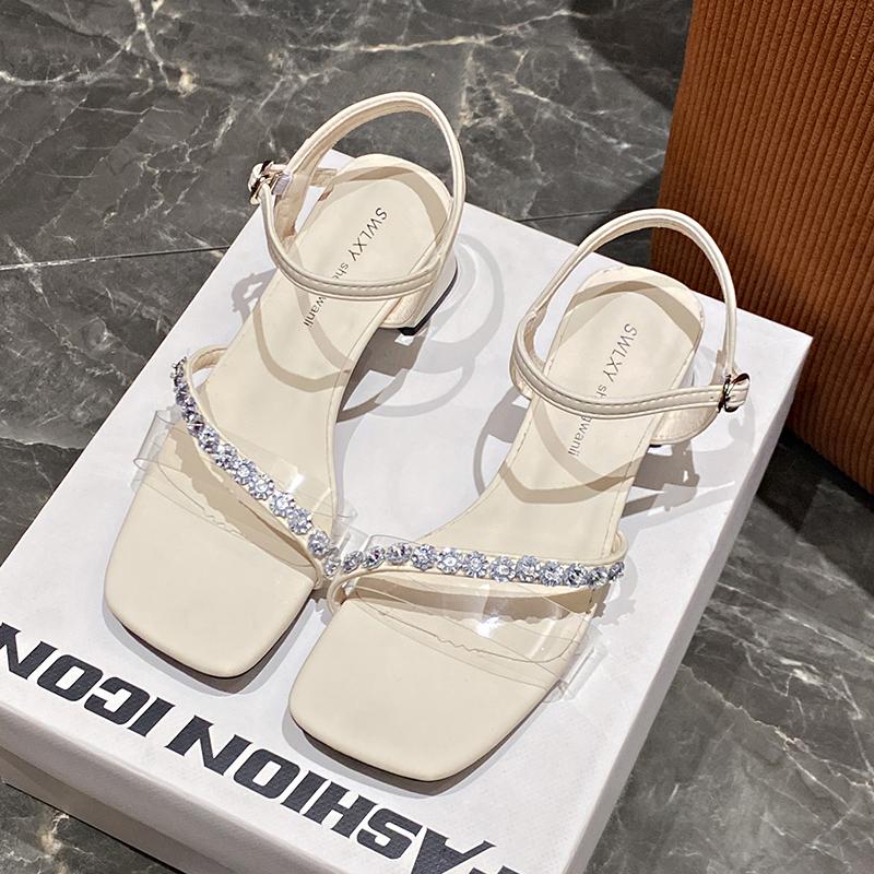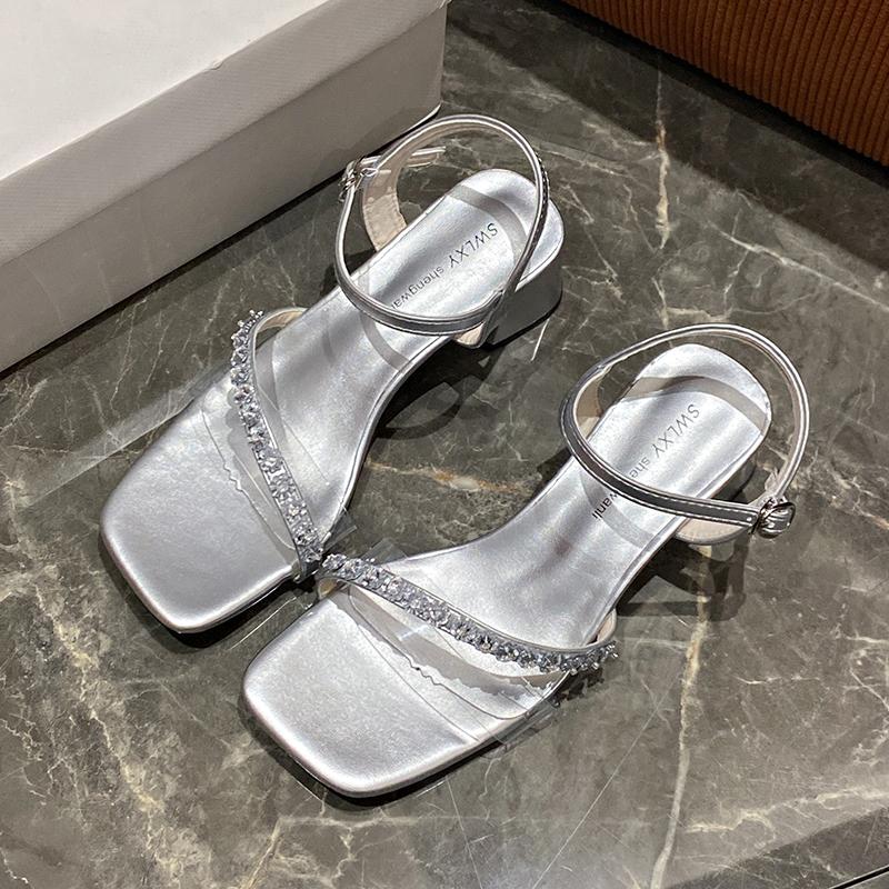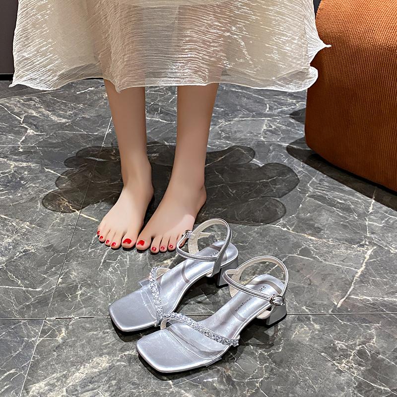 Модные женские босоножки с квадратной головкой, летние, новые, с открытым носком, стразами и модным темпераментом, на высоком каблуке