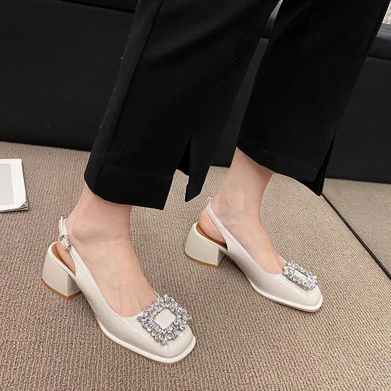 Модные босоножки на среднем каблуке со стразами, женская обувь 2024 года, новые летние модные туфли Мэри Джейн с квадратным носком, женские туфли с открытой пяткой, сандалии
