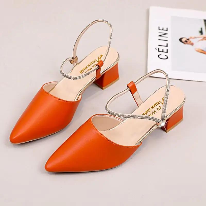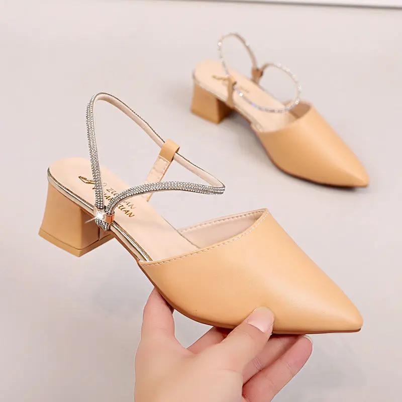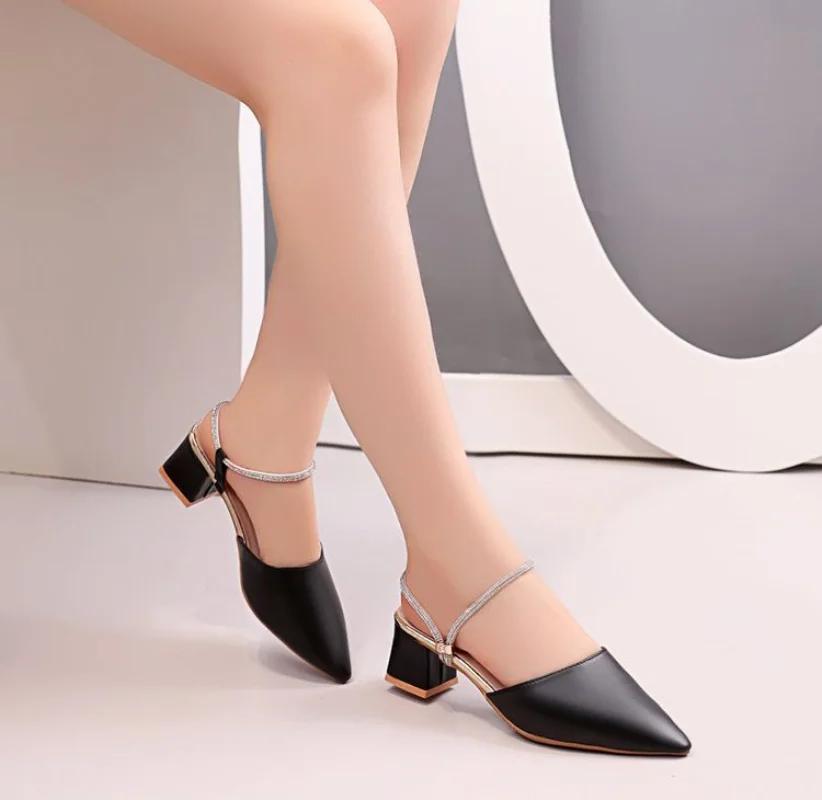Модные женские босоножки со стразами на среднем каблуке, квадратные, лето 2024, с острым носком, женские туфли, ромбовидная черная обувь, Корея, VIP F