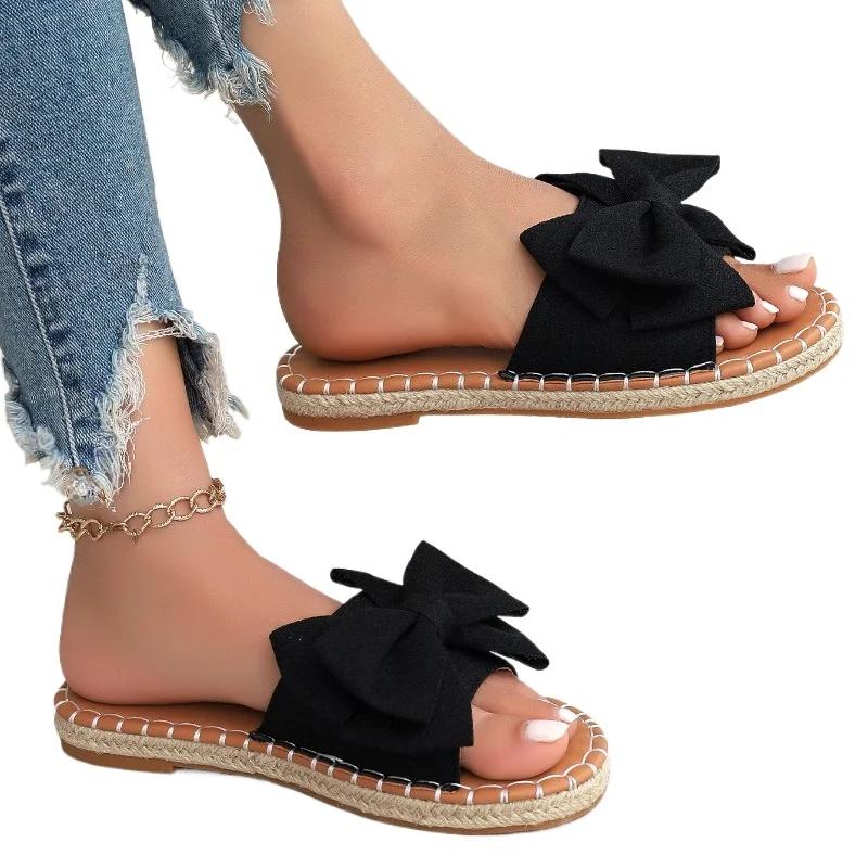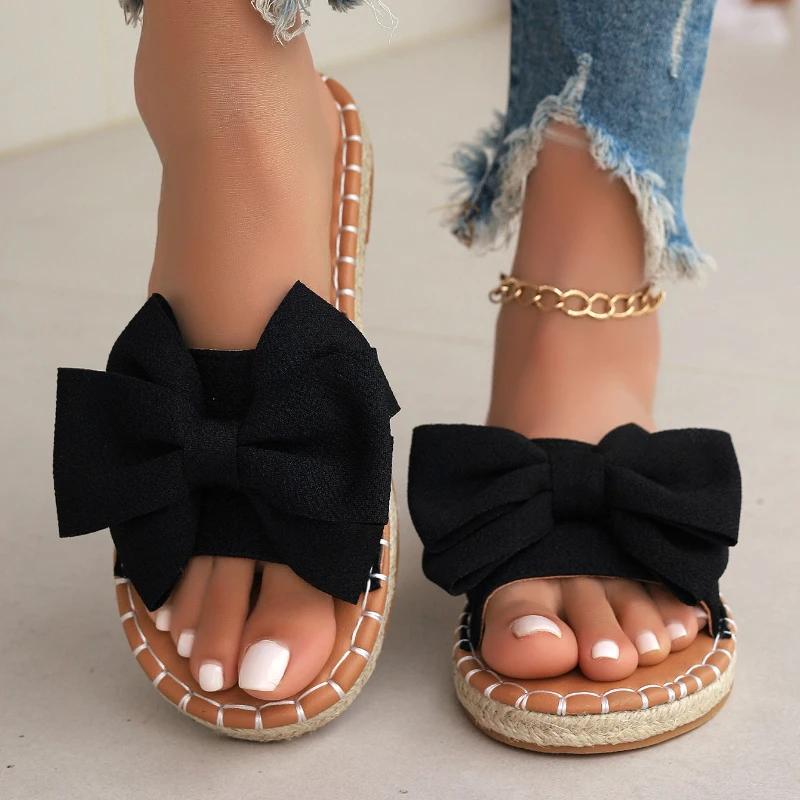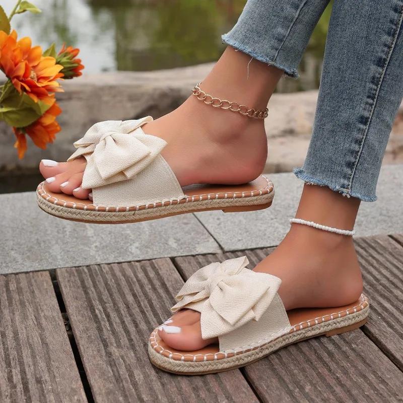 Мода 2024 года, горячая распродажа, женская обувь с открытым носком, женские тапочки, летние тапочки с бантом, сплошная подошва, повседневные пляжные тапочки большого размера