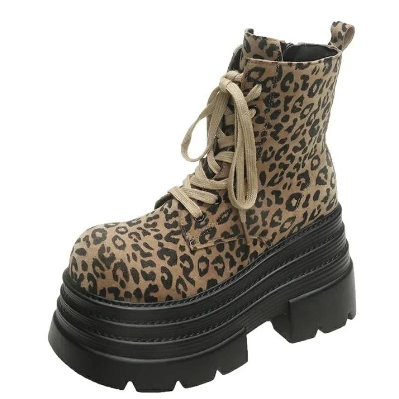 Модные женские ботильоны на платформе 10 см с леопардовым принтом, мотоциклетные ботинки, массивные кроссовки на шнуровке, трендовые зимние готические короткие ботинки Mujer