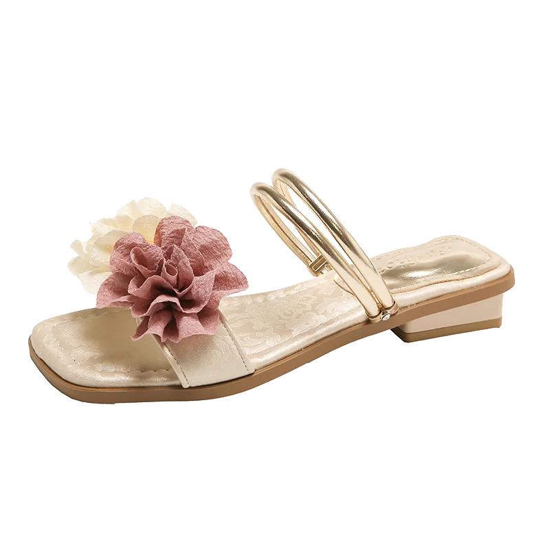 Модная обувь для женщин 2024 года, модные женские тапочки с квадратным носком, летние, с открытым носком, однотонные, с цветами, на низком каблуке, повседневные, удобные тапочки