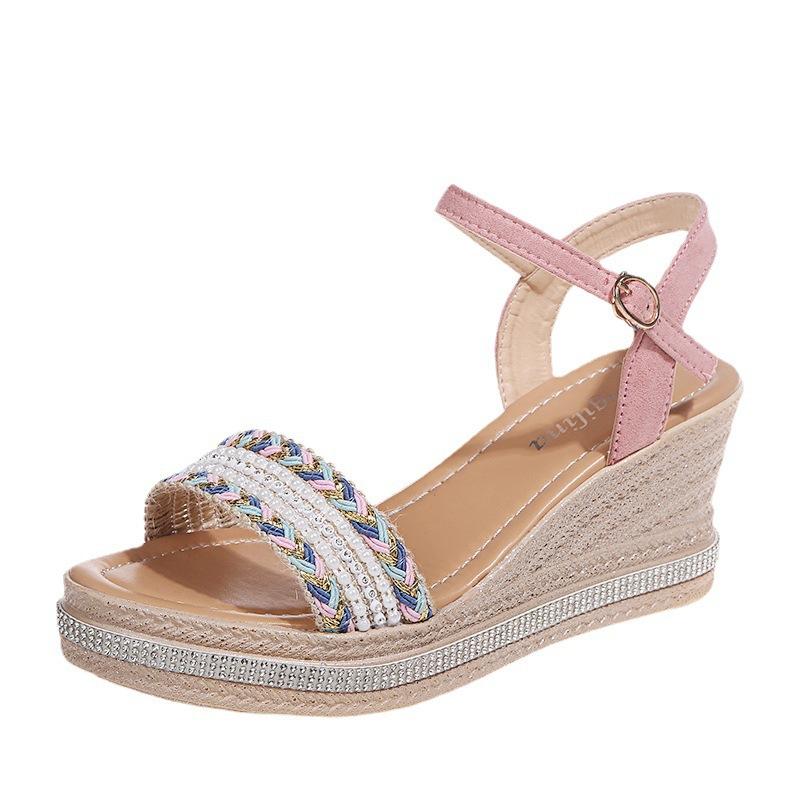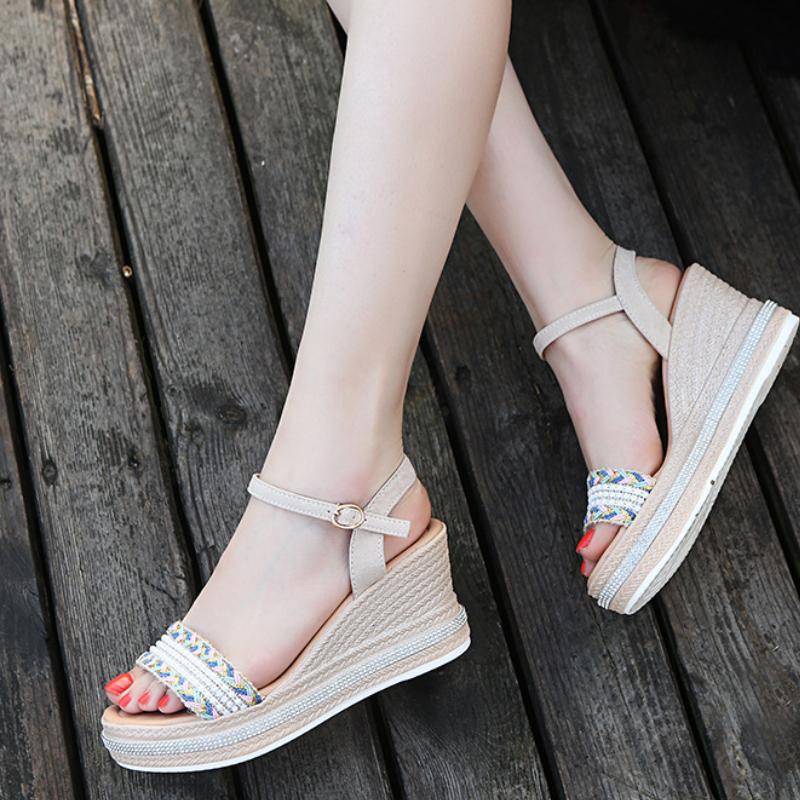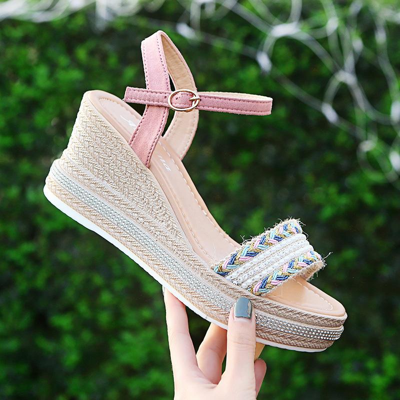 Мода 2024 Лето Новые Босоножки на покатом каблуке со стразами для женщин Модная трикотажная обувь для женщин Босоножки на толстой подошве Женская обувь на высоком каблуке