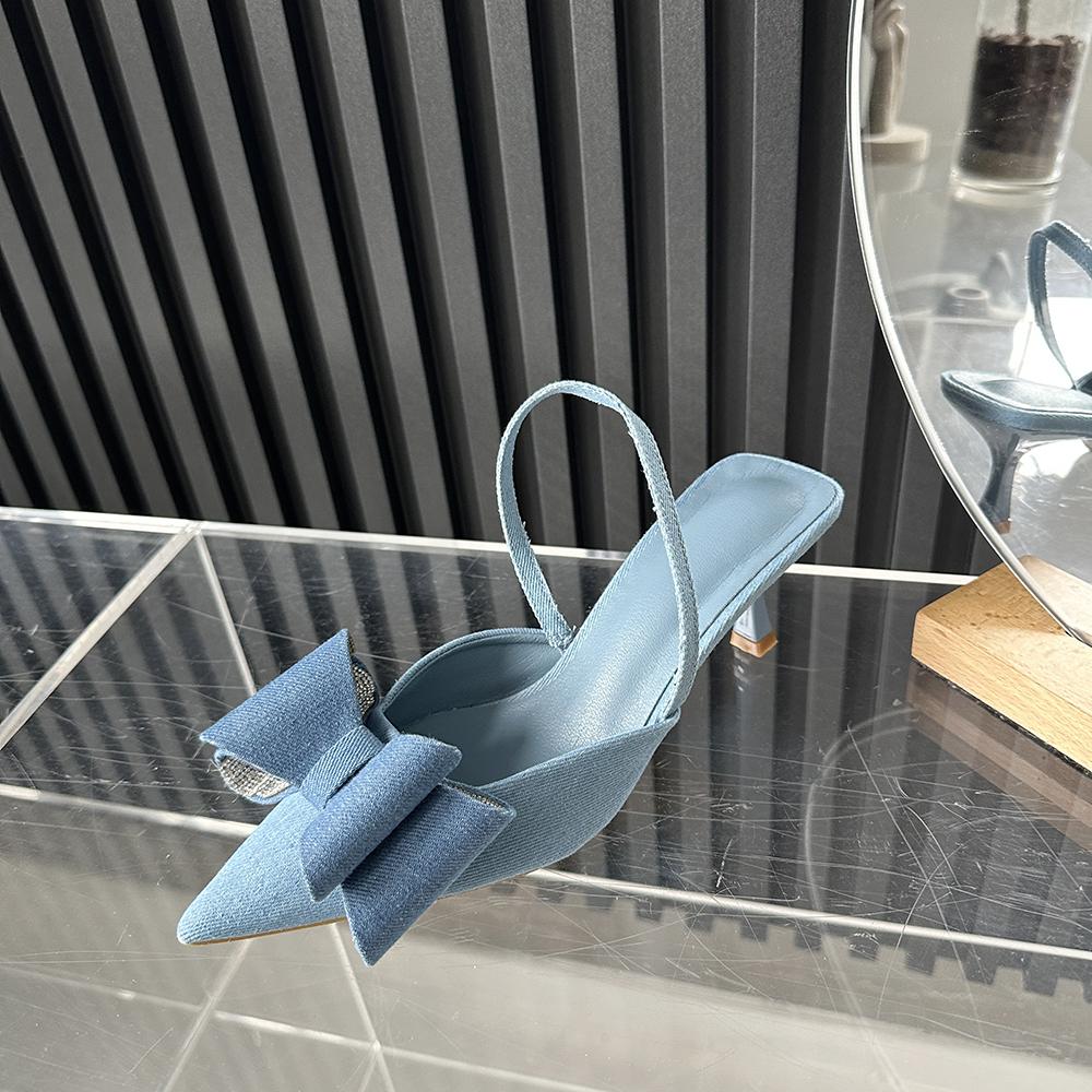 Модные женские сандалии с острым носком, дизайн с бантом, 2024, новые поступления, туфли-лодочки для вечеринок, тонкие туфли на среднем каблуке, ремешок сзади, джинсовая ткань, сандалии с эластичным ремешком