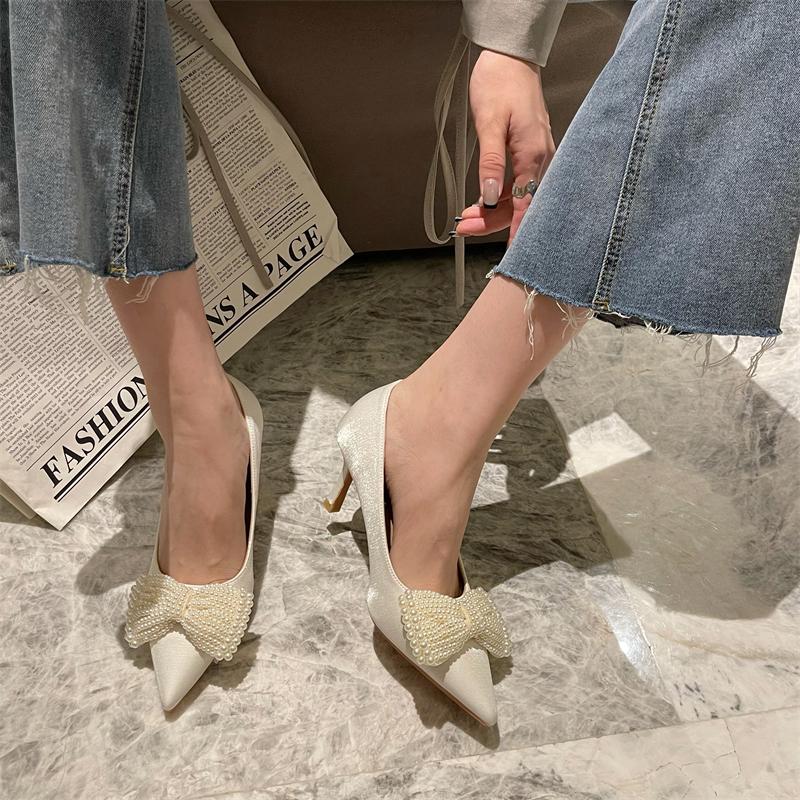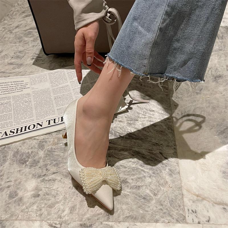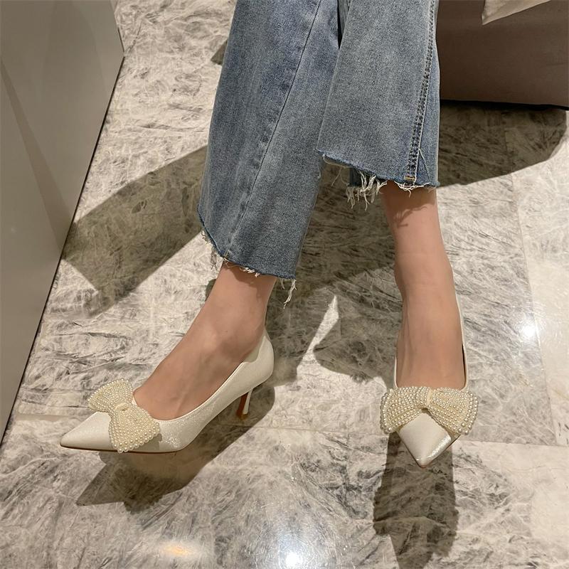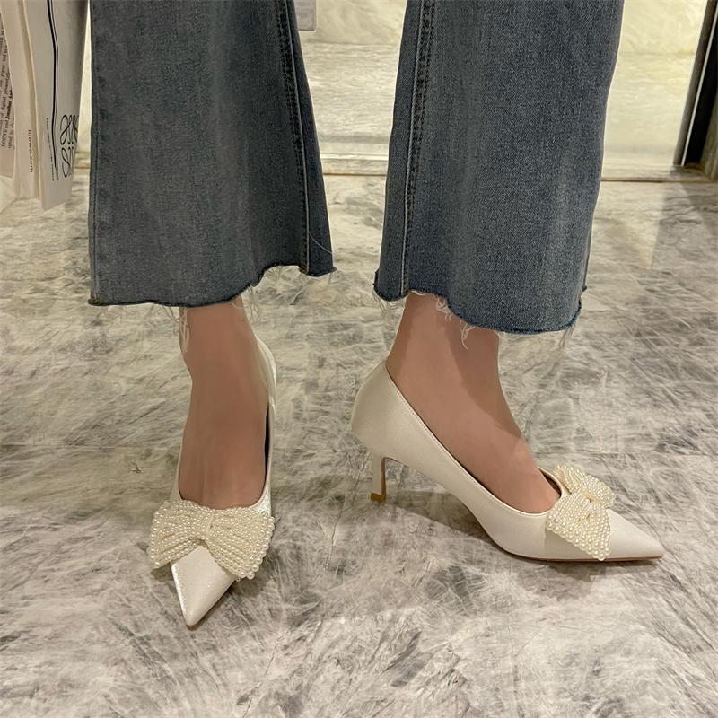 Мода 2024 года, женские свадебные туфли, туфли-лодочки на низком тонком каблуке, с острым носком, с большим бантом и жемчужным дизайном, модные туфли для вечеринок, размер 35-40