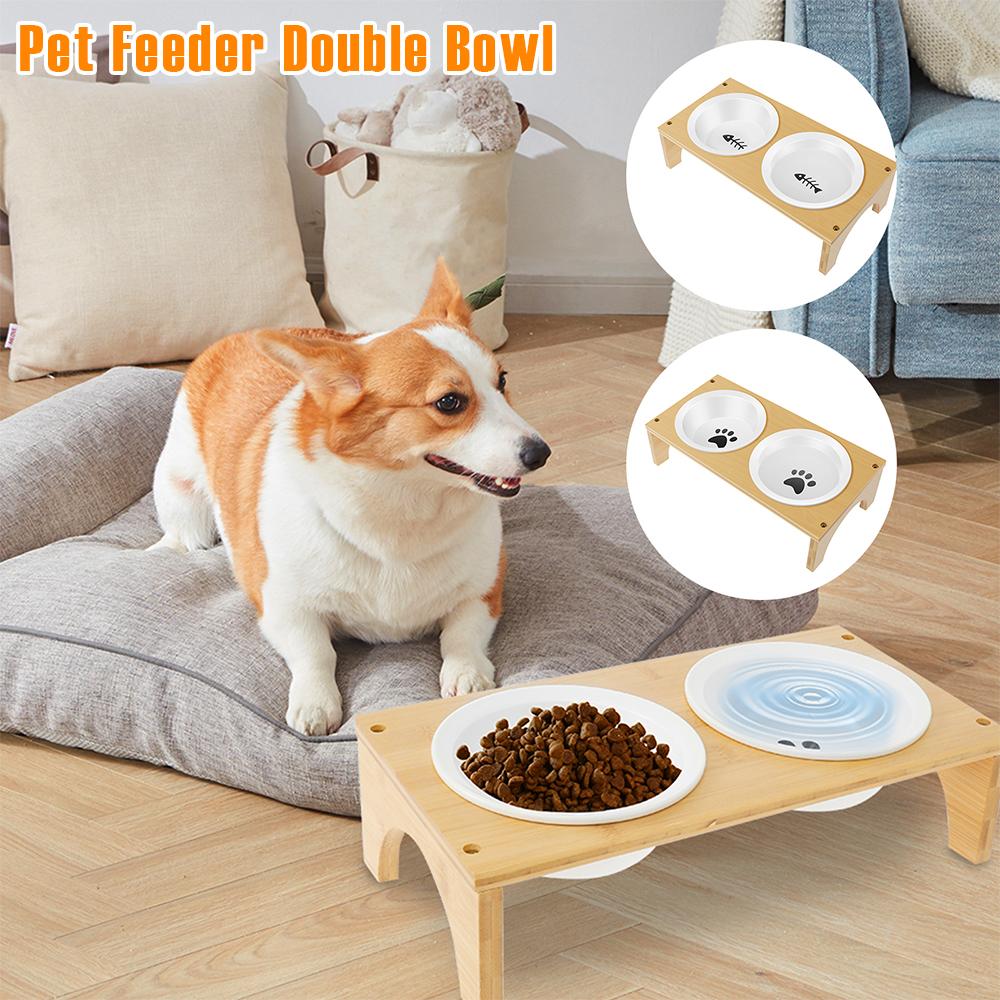 Миска для домашних животных двойная керамическая для собак и кошек с бамбуковой подставкой приподнятая с защитой шеи миска для корма и воды для собак аксессуары для домашних животных