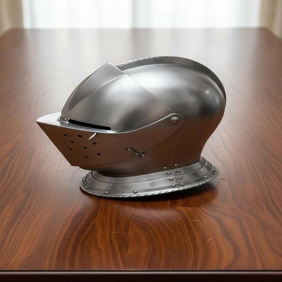 Bring the valor and craftsmanship of the Middle Ages to life with this Handcrafted Close Helmet, a true masterpiece for Renaissance enthusiasts, medieval collectors, and historical cosplay lovers. Expertly handmade by skilled artisans, this authentic knight’s helmet replicates the iconic design worn by European knights during the 15th and 16th centuries. Each detail — from the smooth curvature of the visor to the hand-polished steel finish — evokes the proud spirit of the medieval battlefield and royal tournament.