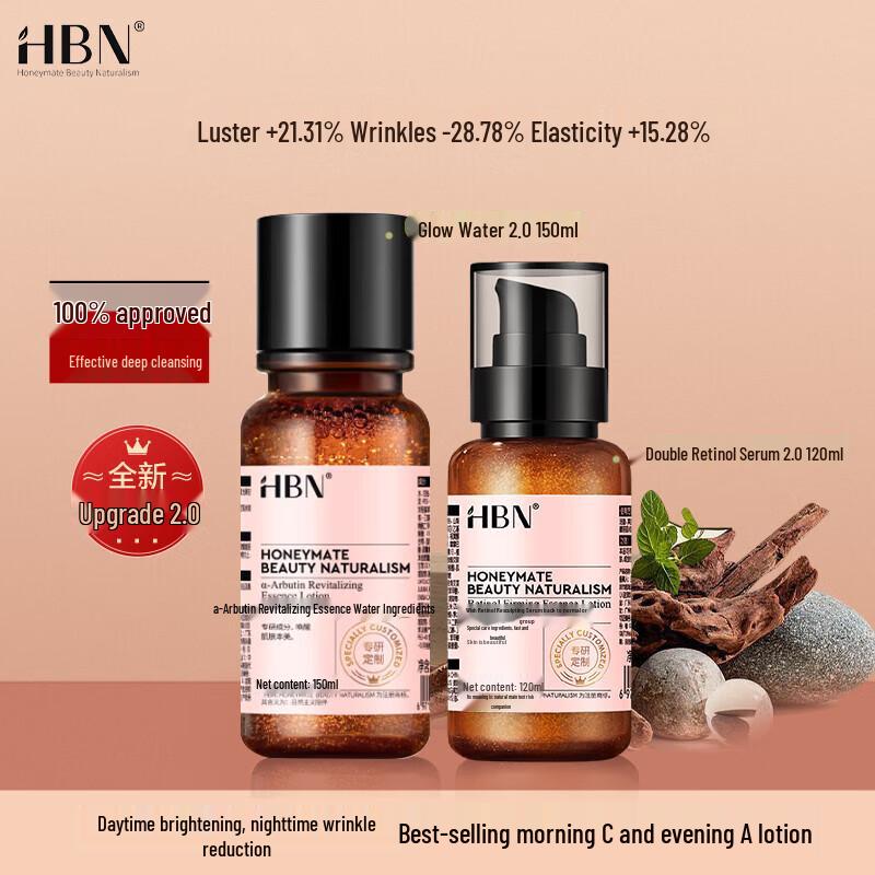 This HBN skincare set is designed for the 'Early C Late A' routine, featuring α-Arbutin Radiance Essence Water and Retinol Sculpting Serum. It delivers comprehensive benefits including deep hydration, firming, anti-wrinkle action, and lasting moisture, promoting a radiant and youthful complexion.