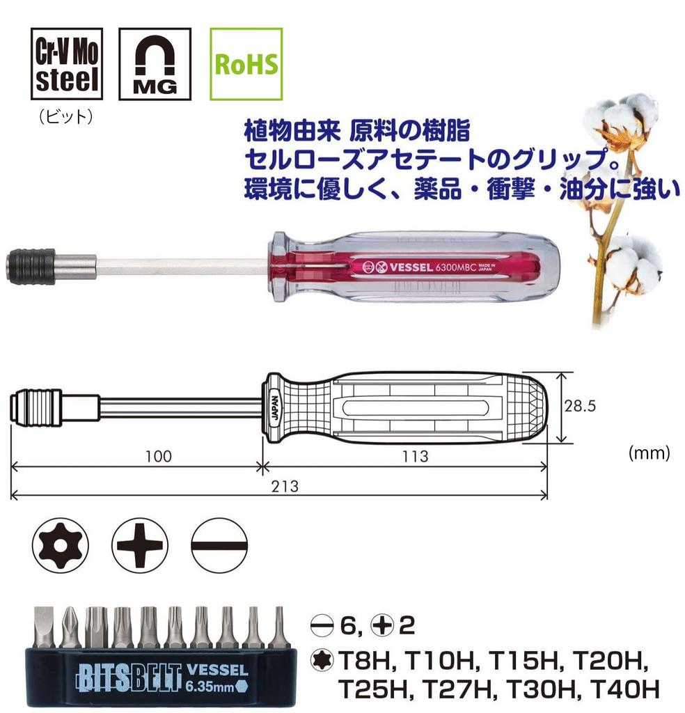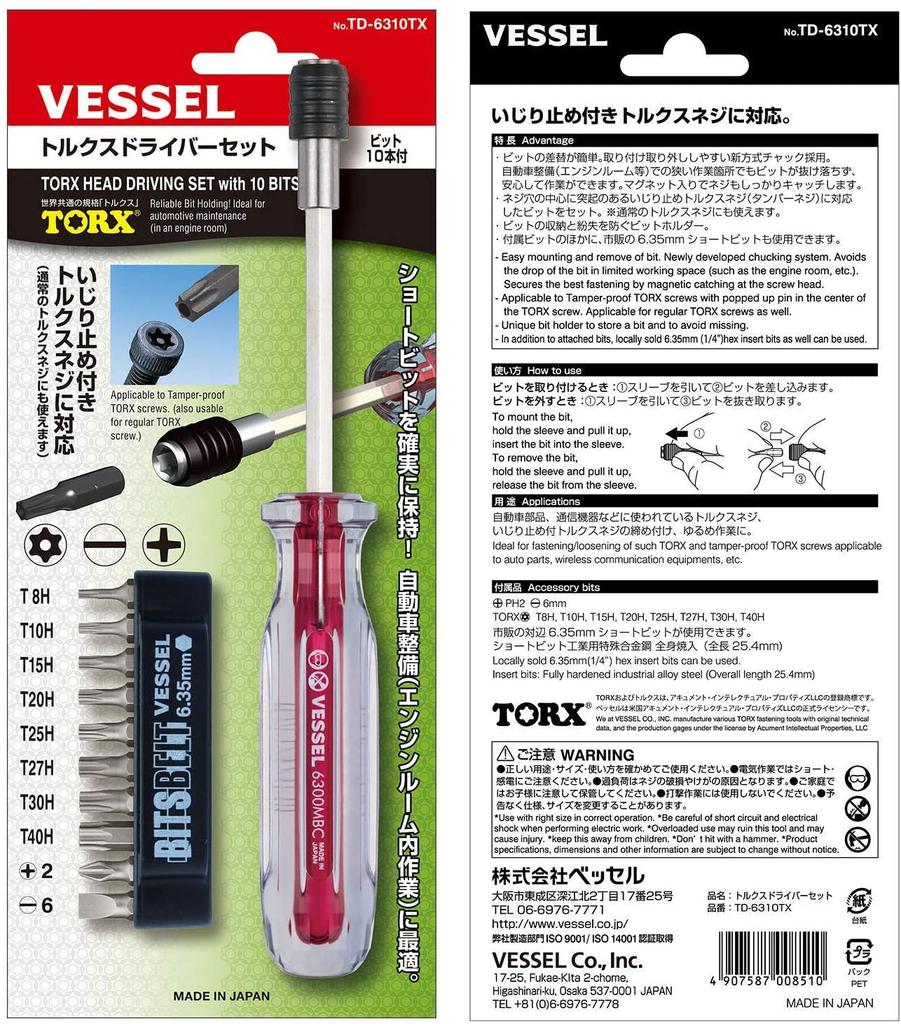 Набор отверток Torx VESSEL со сменными короткими (10 бит) Биты, TD-6310TX