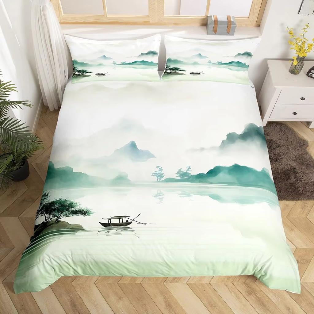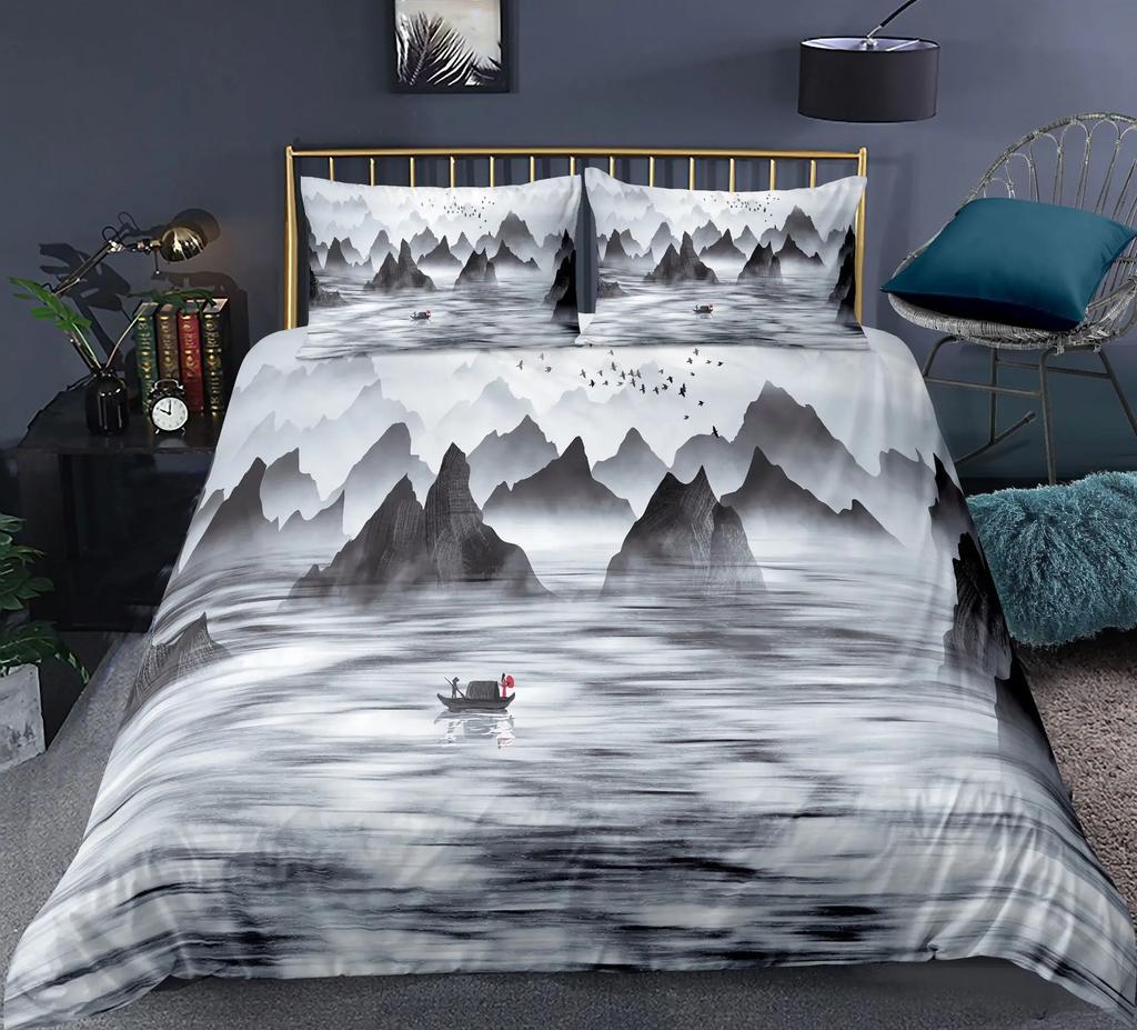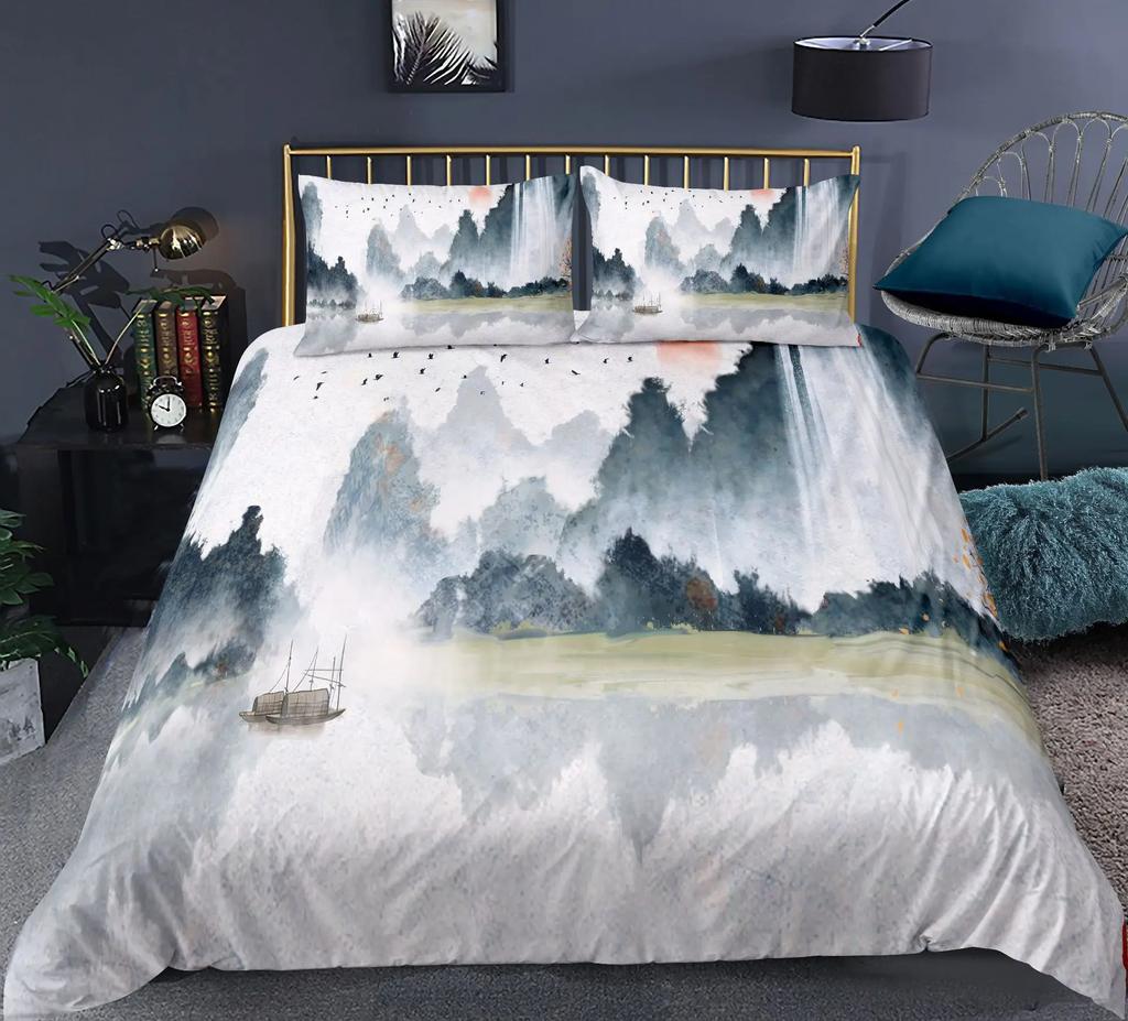 Пейзажный пододеяльник размера кинг-сайз для двуспальной кровати, комплект постельного белья с традиционной китайской культурой, живопись тушью, украшение для дома, набор из 3 предметов