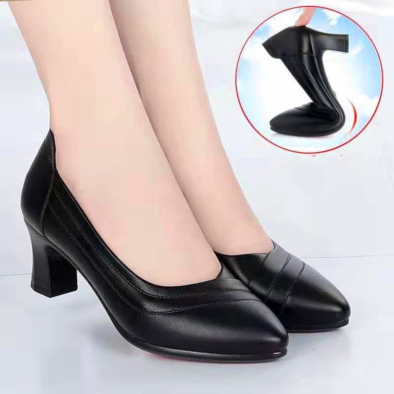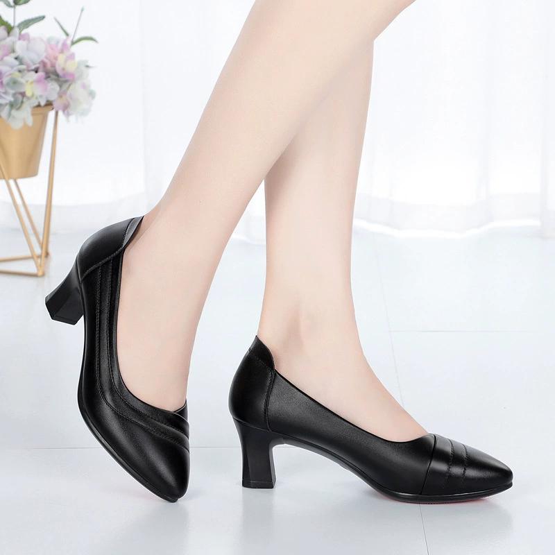 Удобная мягкая кожаная рабочая обувь Мягкая подошва Удобный средний каблук Четыре сезона Одинарная обувь Женские туфли на толстом каблуке Нескользящая кожаная обувь