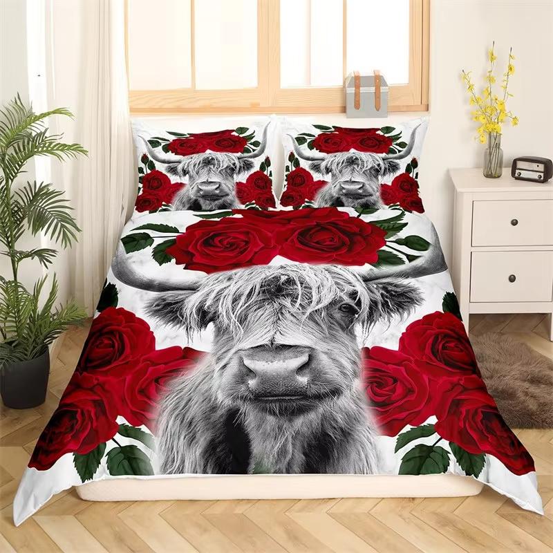Kids Highland Cattle Flower Duvet Cover Set Farm Animal Bull Cow Comforter Cover Microfiber Western Cowboy Twin King Bedding Set