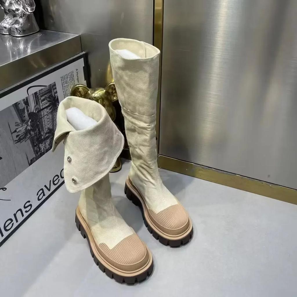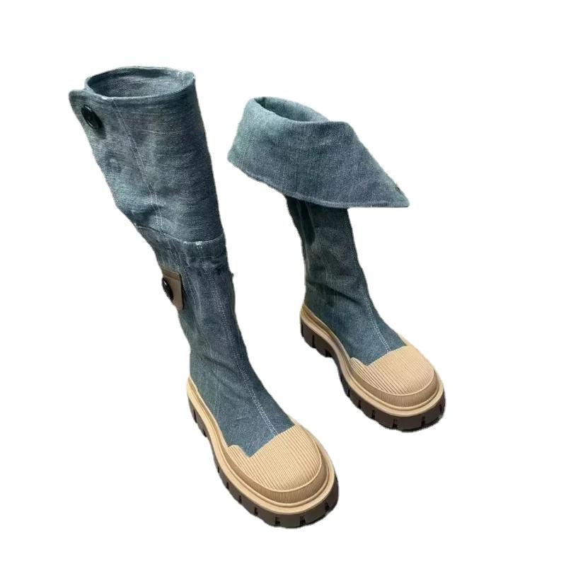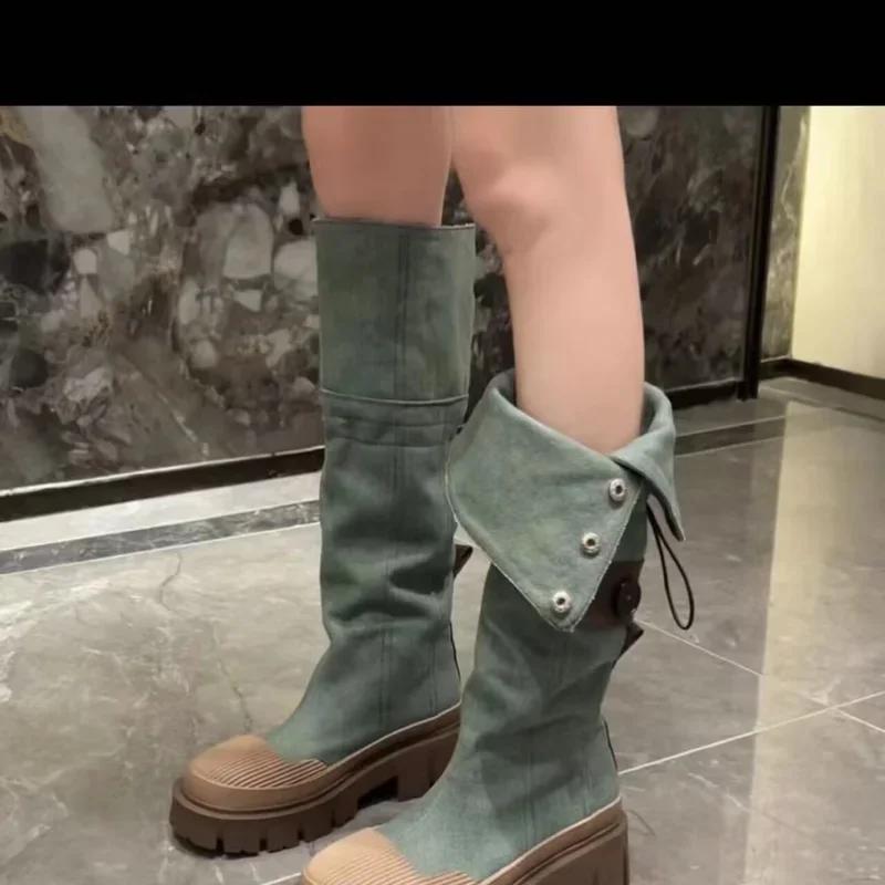 Модные джинсовые ботинки на толстой платформе для женщин 2024 года, осенние ковбойские сапоги в стиле вестерн в стиле пэчворк, женские толстые каблуки, ботинки до середины голени