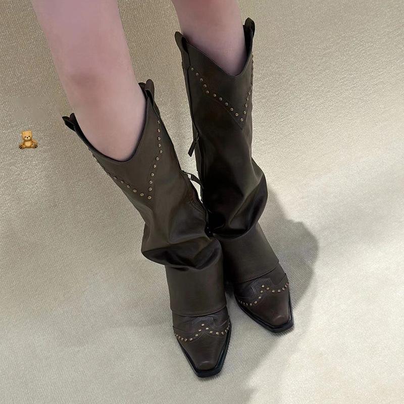 Мода осень новый ретро остроносый ковбойские женские сапоги коричневые заклепочные брючные сапоги толстые каблуки длинные сапоги-трубы Botas De Mujer